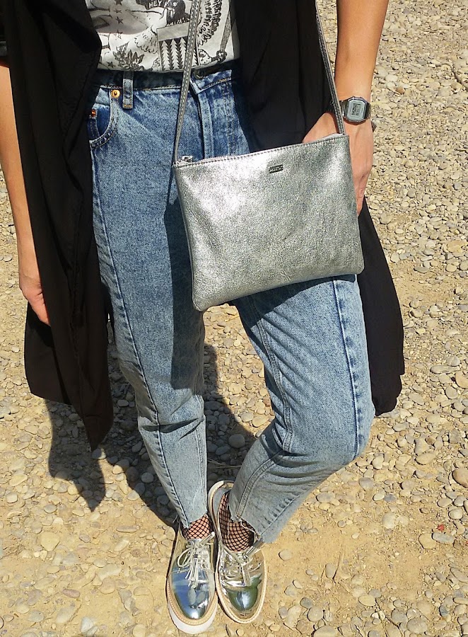 Un cardigan negro finito para no morir con este calor, zapatos metalizados y bolso plateado.