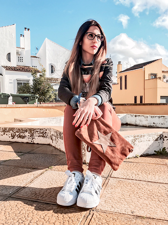 La he combinado con una camisa vaquera debajo de ella, mis jeans de color marrón y mis Adidas Superstar. Y para completar el look he usado un bolso clutch marrón con una "Superstar" en el centro.