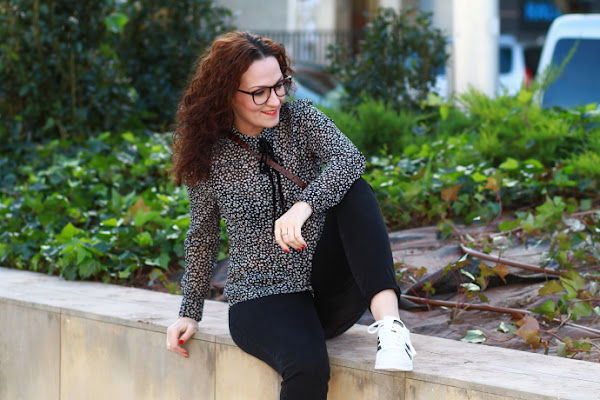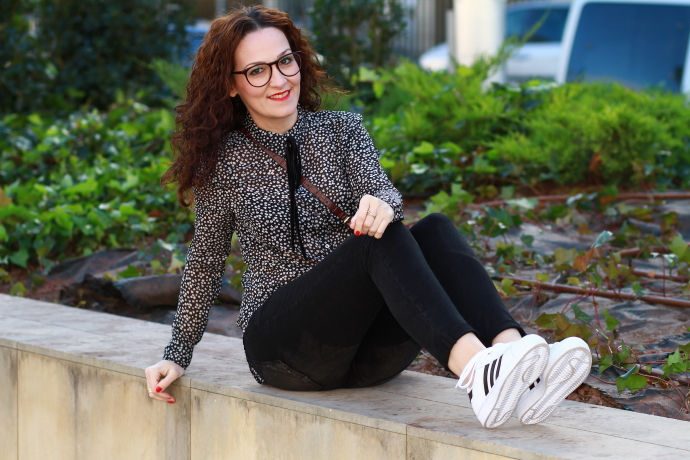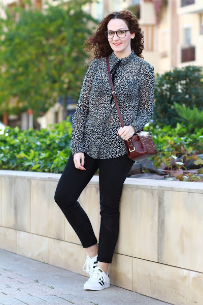 El domingo pasado amaneció un día fantástico con solazo, pero llegó un cierzo horroroso que te imposibilitaba estar en la calle. A pesar de todo quedamos con los amigos para tomar el vermut y aproveché para hacerme estas fotos. Me decanté por la comodidad a la hora de vestir estrenando mis nuevas Adidas Superstar que combiné con jeans pitillo, camisa con lazada en el cuello y chaqueta biker. Supongo que os habrá llamado la atención verme con gafas, al trabajar en una oficina me paso muchas horas delante del ordenador y la pantalla me provoca estrés ocular que me hace tener fuertes dolores de cabeza. Así que después de estar esa mañana en casa con el ordenador y sentirme tan a gusto llevando mis nuevas gafas Firmoo decidí dejármelas puestas. Estoy segura que volveré a comprarme más gafas en su web sobre todo con los descuentos que ofrecen. Además, me resultó muy fácil realizar la compra, con el simulador pude saber si me quedaban bien y a la hora de indicar la graduación que necesitaba solo tuve que seguir unos sencillos pasos y en menos de una semana las tenía en casa.