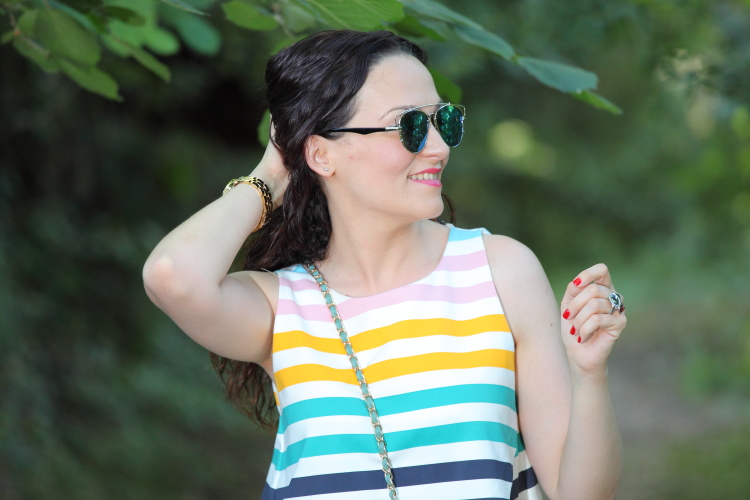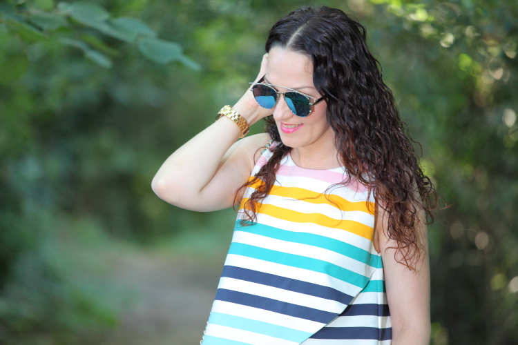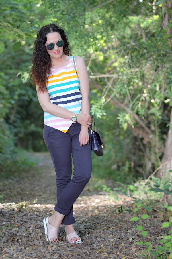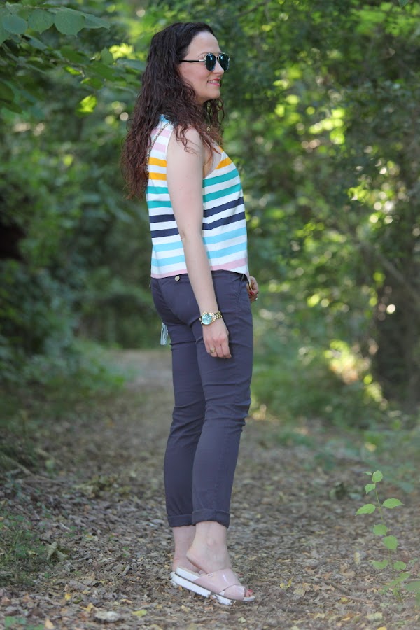 Hace unos días os enseñé este look en mis redes sociales y como os gustó bastante he pensado en mostrároslo aquí con más detalle. Llevo un top de rayas asimétrico que le estoy dando mucho uso este verano, además de fresquito el colorido que tiene lo hace muy fácil de combinar, aunque con estos pantalones es como más me gusta llevarlo. En los pies mis sandalias de plataforma que son ideales para ir cómoda y un bolso bandolera azul marino que me chifla. Ya habréis observado que lo tengo también en marrón como os enseñé aquí, ya os he dicho alguna vez que cuando algo me gusta mucho no dudo en comprármelo en más de un color.