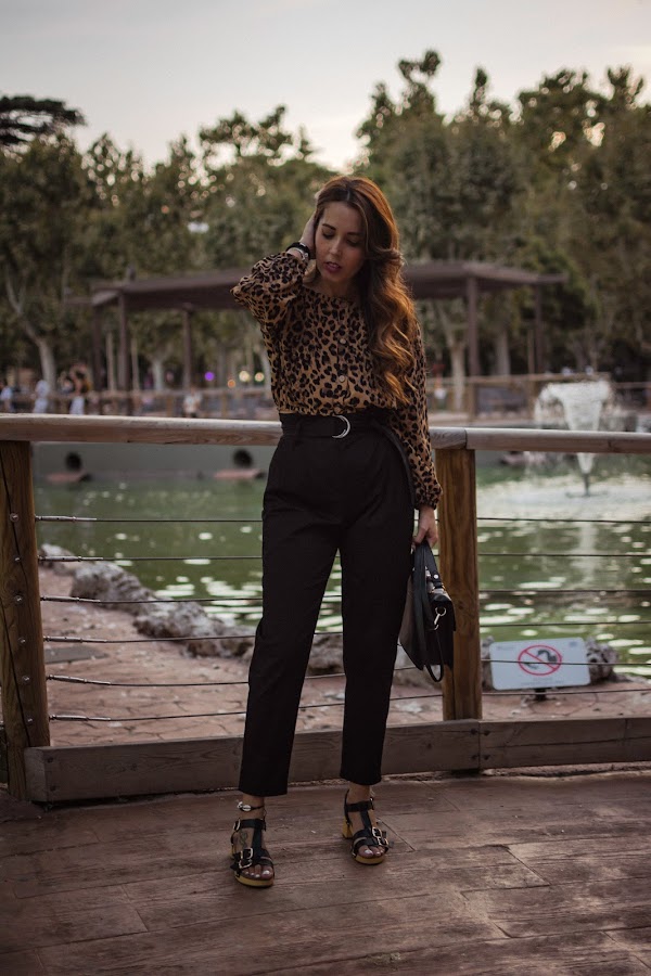 Para centrar como siempre toda la atención en el estampado, el color negro es el mejor aliado para el resto de prendas y complementos. Me decidí por completar el outfit con un pantalón de vestir en color negro, con cinturón y cintura alta, bastante ceñido en la zona para así resaltar la figura. Las sandalias aún pueden llevarse dependiendo de los días que amanecen en Valencia, las estoy aprovechando para algunos looks o para simplemente ir cómoda por la ciudad. Estás lo son, con ellas puedo caminar sin cansarme, son en color negro y madera y llevan detalles dorados, me venían perfectas para combinarlas con el bolso, también en negro y dorado. Es súper chulo, me recuerda mucho a los adornos de Gucci ya que está lleno de insectos de color dorado.