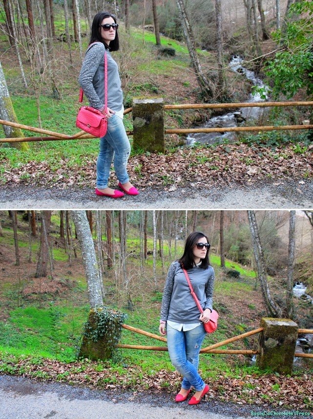 Today I"m a look made ??up my new slippers Russian fuchsia color, super comfy and easy to combine and this time I decided to take them with gray. Wear gray sweater with glitter sleeves and jewel neck white shirt, ripped jeans and matching slippers with pink handbag in ostrich skin.