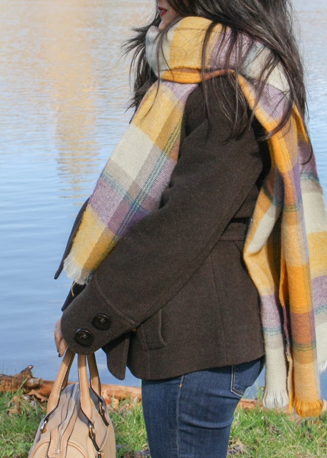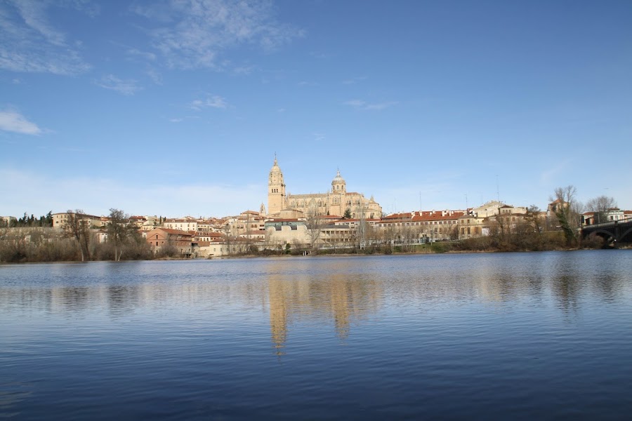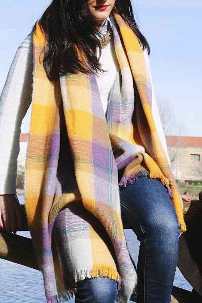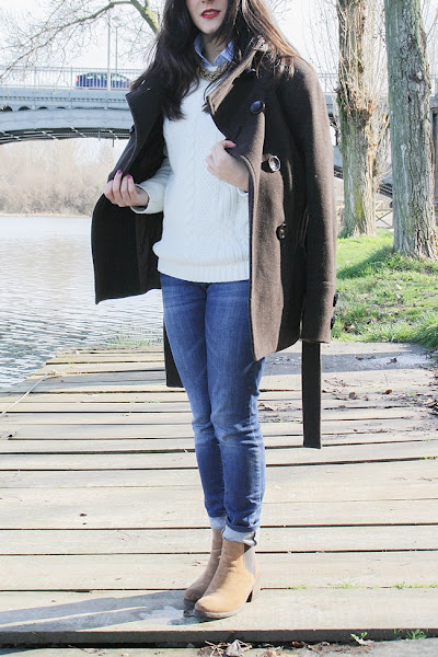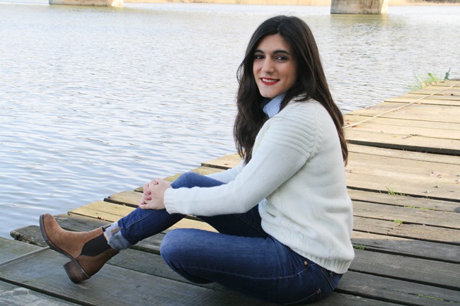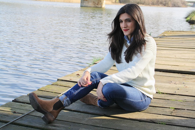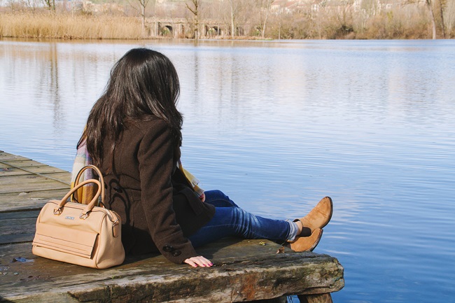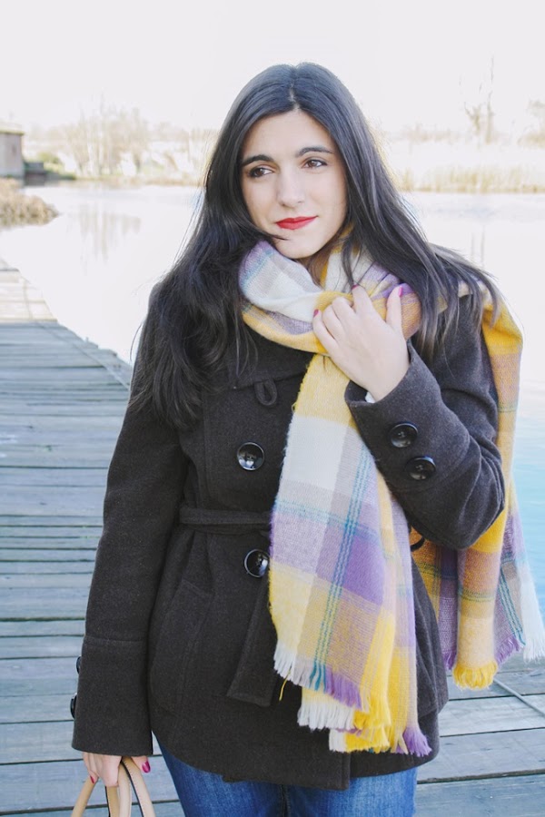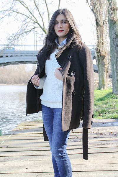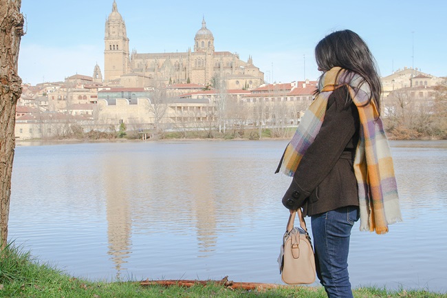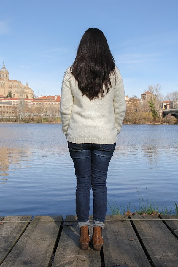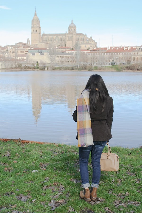 A principios de año, Montse y yo fuimos a dar una vuelta por Salamanca un sábado por la mañana y llegamos hasta un pequeño embarcadero que hay junto al río. Es el lugar donde ponen barquitas para los meses de calor pero en invierno está solitario y tranquilo, así que a veces nos gusta ir. A pesar de que hacía frío (es Salamanca, duh!), estuve muy a gusto con mi jersey nuevo, un abrigo marrón y una bufanda a cuadros que me regalaron por asistir a un desfile de otoño de El Corte Inglés con el periódico (¿He mencionado cuánto me gusta mi trabajo?).