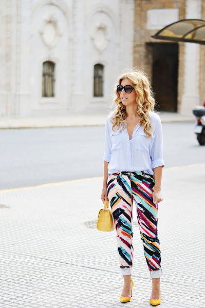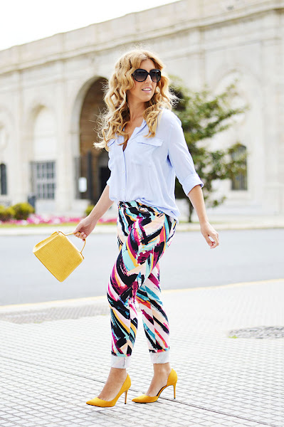 Shirt: Mango / Mustard heels: Mango / Arty Pants: H&M (old) / Mustard bag: Zara