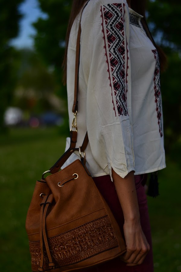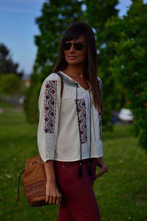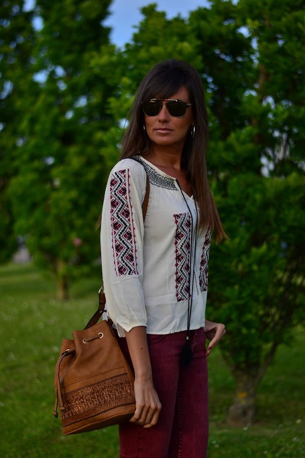 Lo he combinado con esta blusa étnica de manga francesa y cuello barco, con vivos bordados en rojo y negro, que tanto parece que se lleva esta temporada. Concretamente, me gusta mucho el detalle de los pompones. Fijaos...