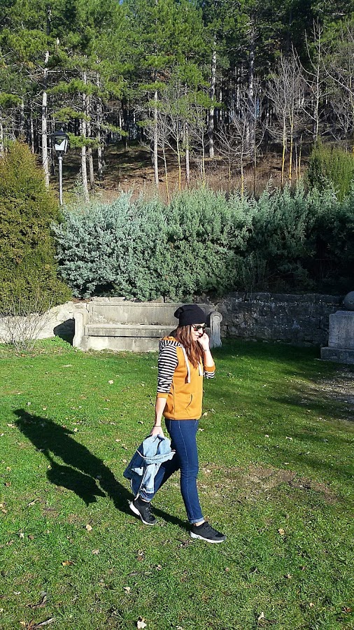 En este look , combiné unos vaqueros elásticos de H&M con una sudadera de Shein color mostaza y rallas negras y blancas en mangas y gorro.