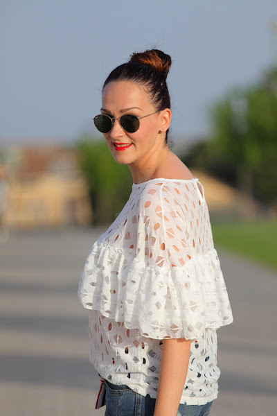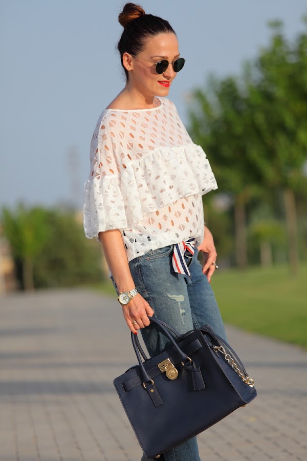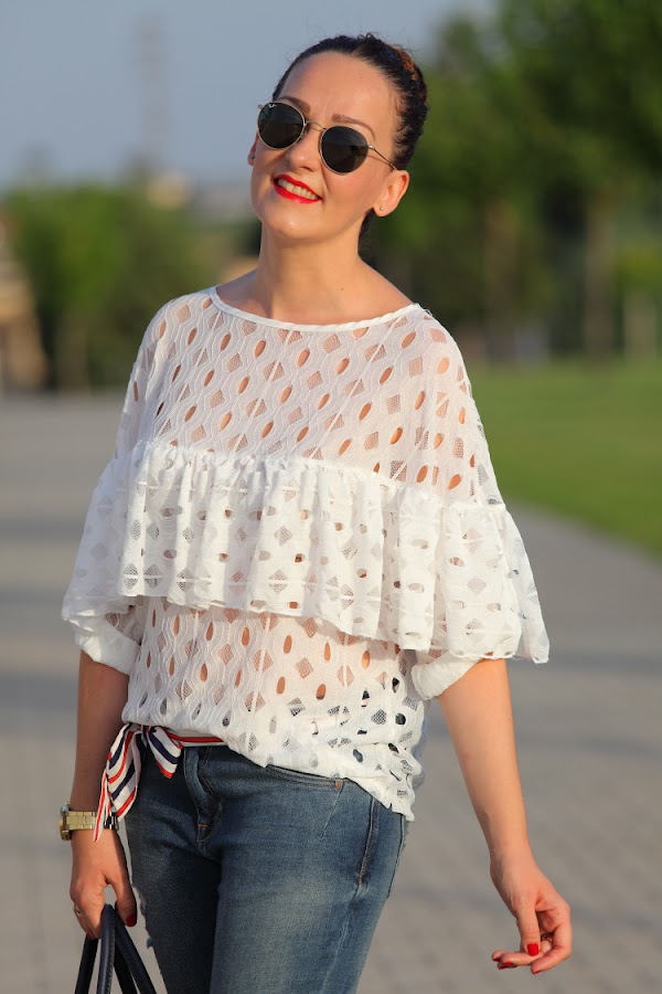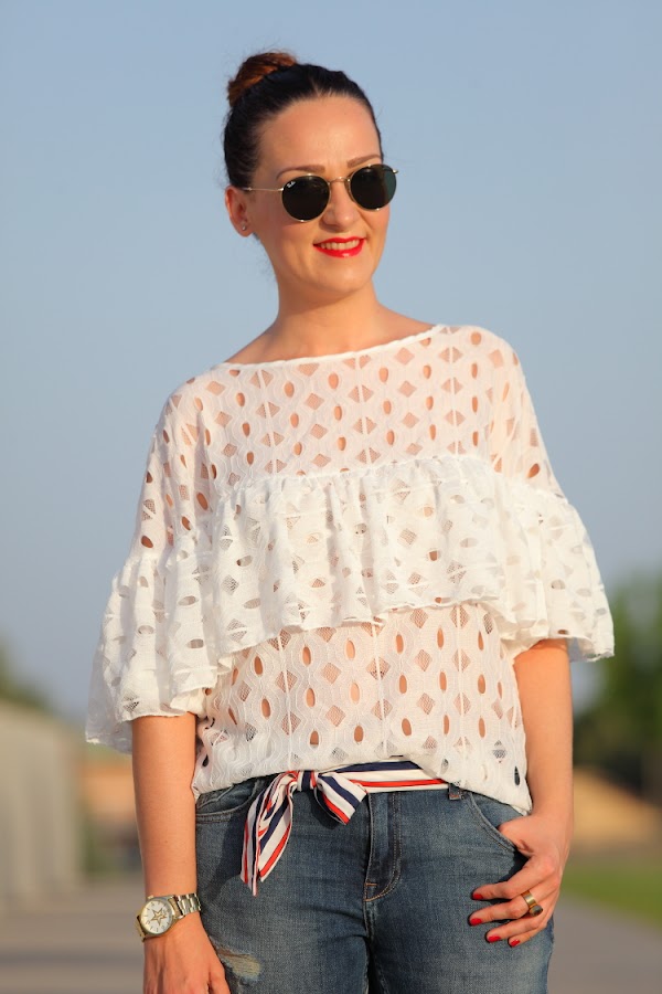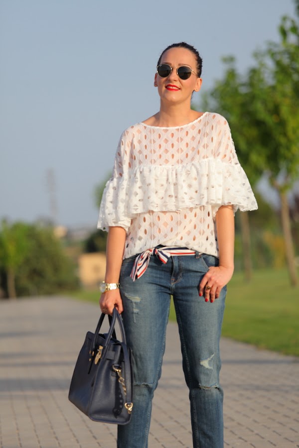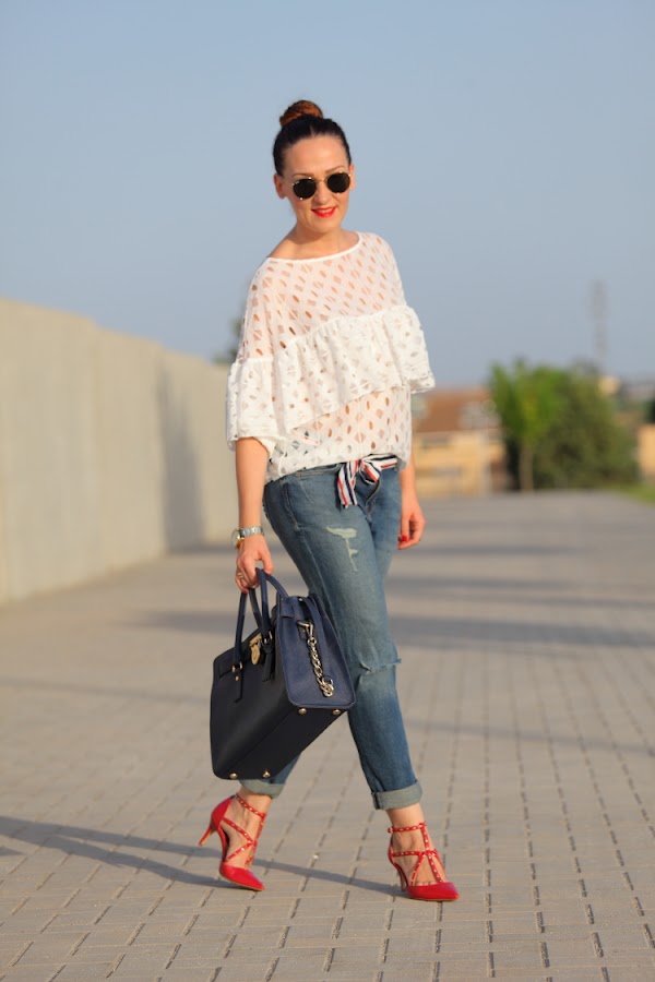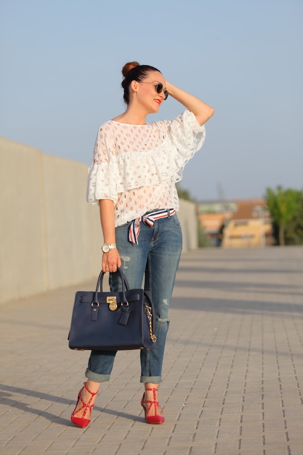 Alguna vez ya os he comentado que cada vez me estoy aficionando más a comprar por internet. Cuando no tienes mucho tiempo libre es una ayuda que con un solo clic tengas tu compra hecha y puesta en casa. Además de las tiendas ya conocidas del grupo Inditex, son muchas más las que ya forman parte de mis preferidas para mis rutas de shopping online. Una de ellas es Sammydress, hasta la fecha nunca he tenido problemas cuando les he comprado, además en su apartado de consultas explica muy bien las dudas que pueden surgir la primera vez que haces un pedido. Una de mis últimas compras es este top con volante, me llegó enseguida y no sabéis lo contenta que estoy con él. Ahora lo llevo solo y con las mangas subidas pero este otoño con camiseta debajo le voy a dar mucho uso también, además tiene un tejido tan agradable. Esta vez me lo puse con tejanos boyfriend, pañuelo a modo de cinturón y mis nuevos zapatos rojos, otro de mis chollos de estas rebajas.