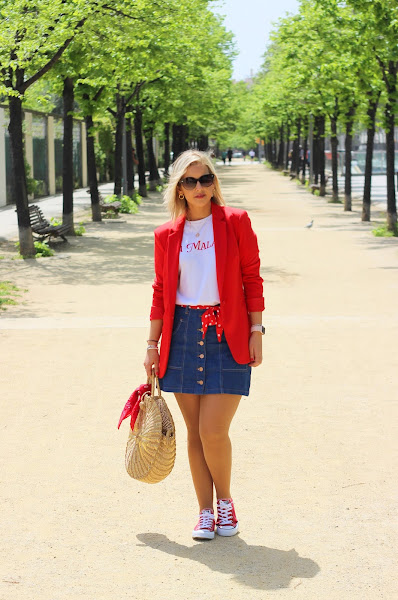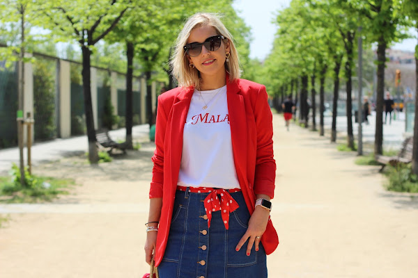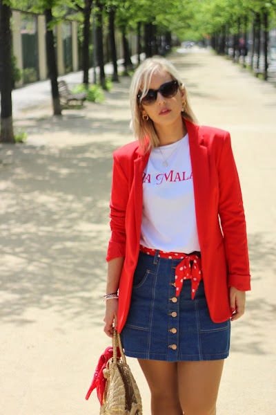 Hoy os traigo un look que me encanta y creo que me podría todos los días. En el look de hoy llevo mi nueva camiseta de Stradivarius con el título de una de mis canciones favoritas "Pa mala yo" de Aitana y Ana Guerra. La he combinado con una falda tejana y una americana roja. El resto de accesorios, fueron mis nuevas Converse rojas, mi bolso redondo de rafia y mis nuevas gafas de Nomo que es una nueva marca de gafas de sol que tienen unos modelos geniales.