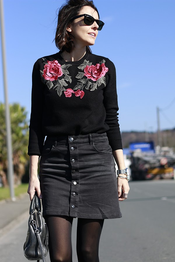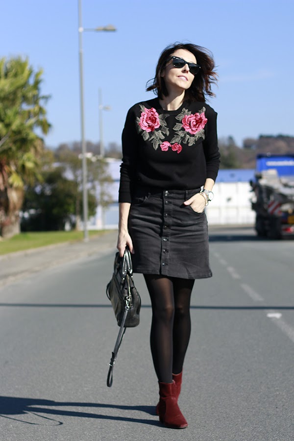 Un jersey especial, lleno de flores que alegra cualquier día un poco tristón, una falda cómoda y trotera para llevar en cualquier ocasión, un abrigo calentito y de tendencia en un color que me llena de luz y unos botines con la altura justa de tacón y de caña, perfectos para llevar con pantalón o falda ¿Algo más?