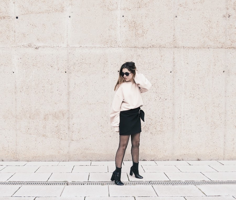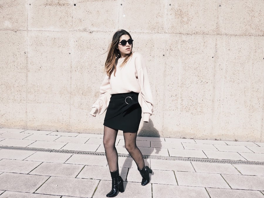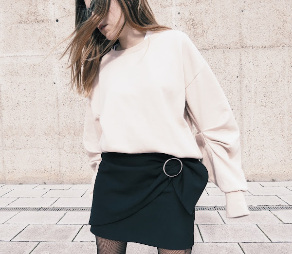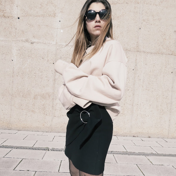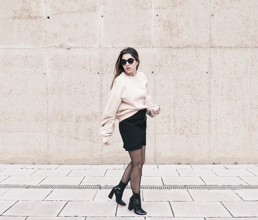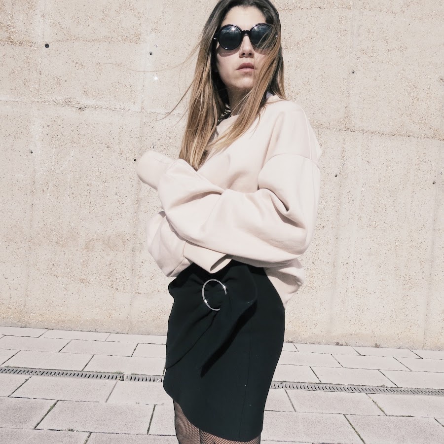 Además llevo una sudadera overside en tono nude con las mangas muy anchas y plisadas al final, que sienta genial.