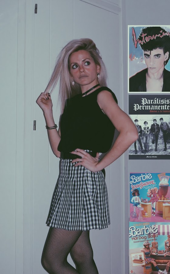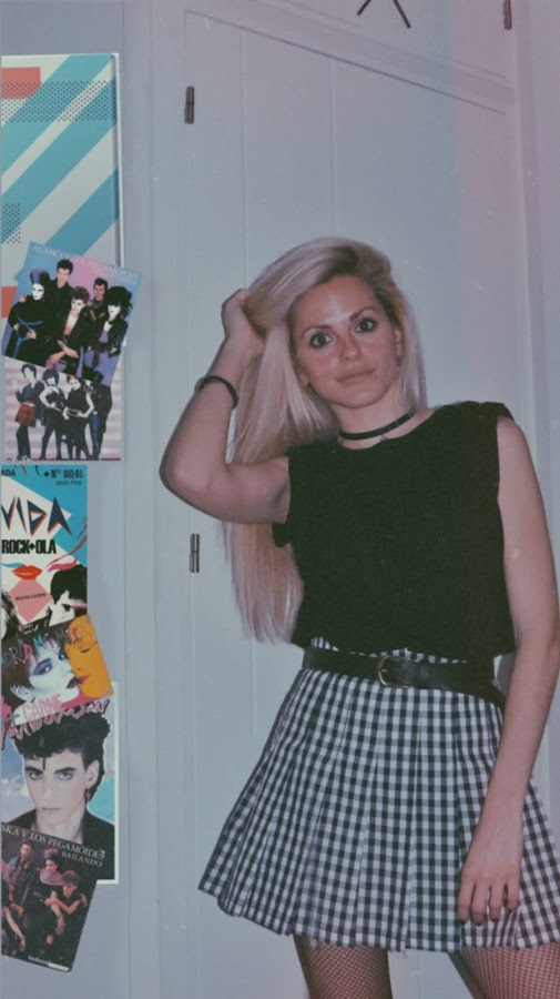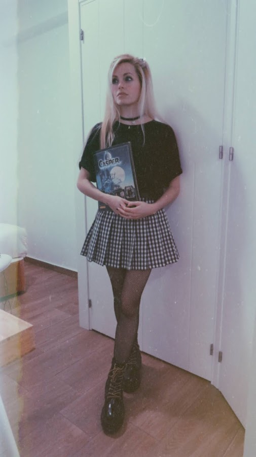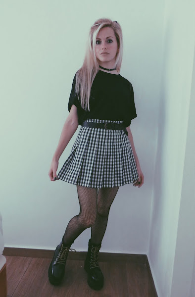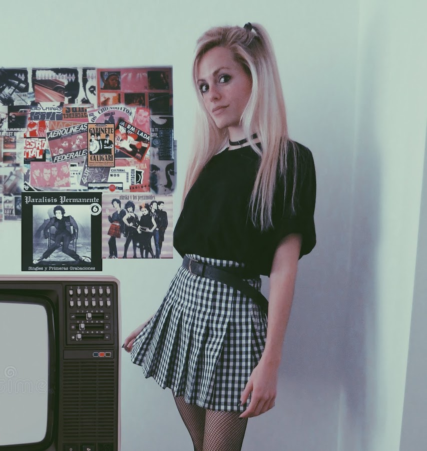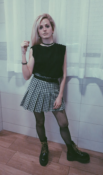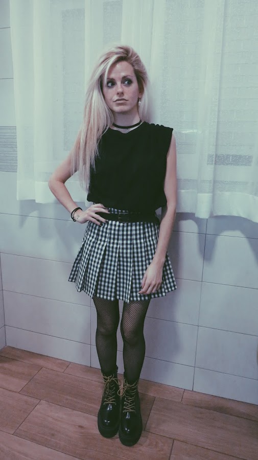 Para el look noventero, combiné la falda con una camiseta básica negra, estilo oversize. Mi principal inspiración ha sido el estilo grunge con cierto toque de la movida madrileña.