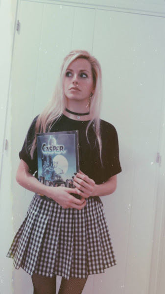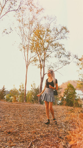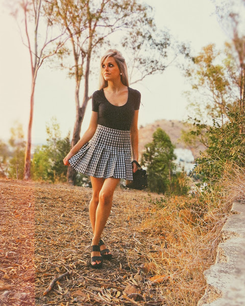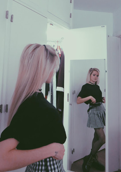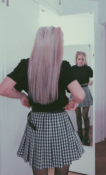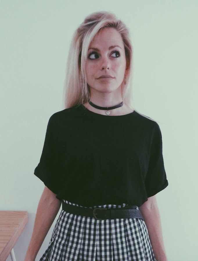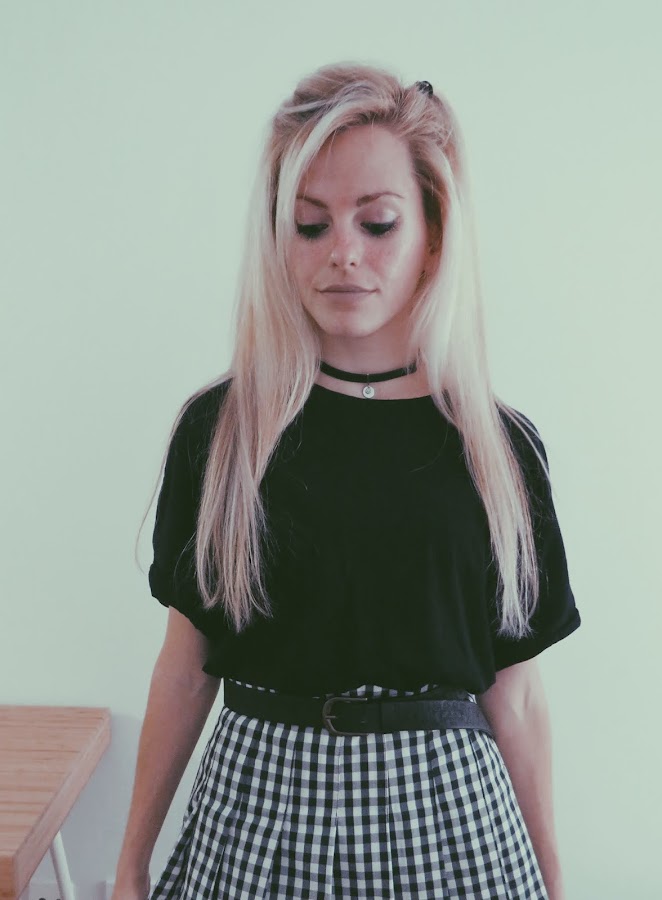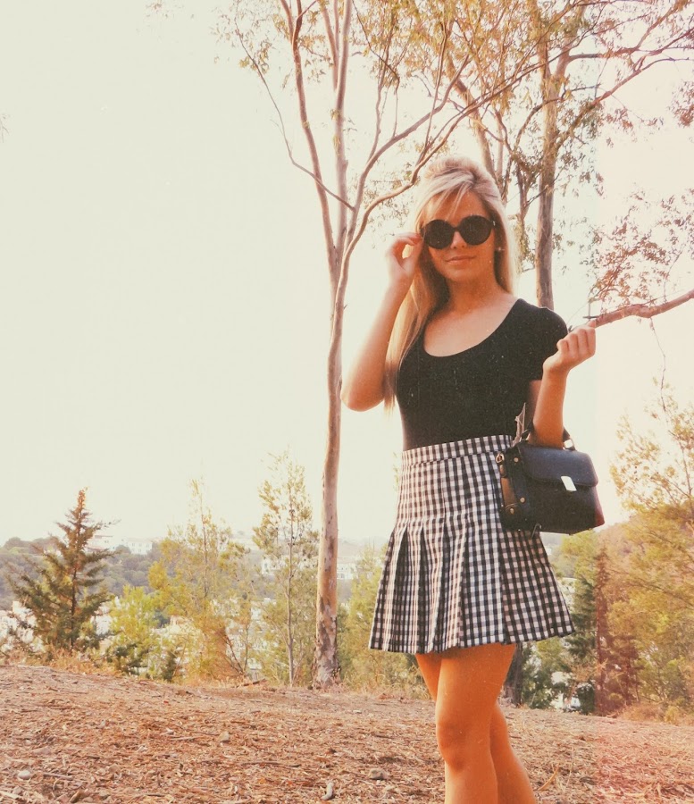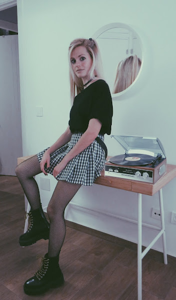 Para el look noventero, combiné la falda con una camiseta básica negra, estilo oversize. Mi principal inspiración ha sido el estilo grunge con cierto toque de la movida madrileña.