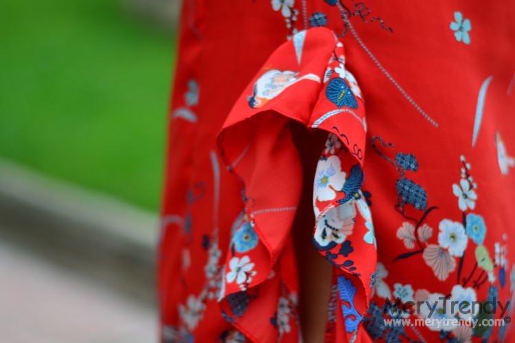Recta, de satén, en color caldera, con estampado oriental y dos aberturas rematadas con un volante... Para mí, la falda perfecta. ¿No os parece?