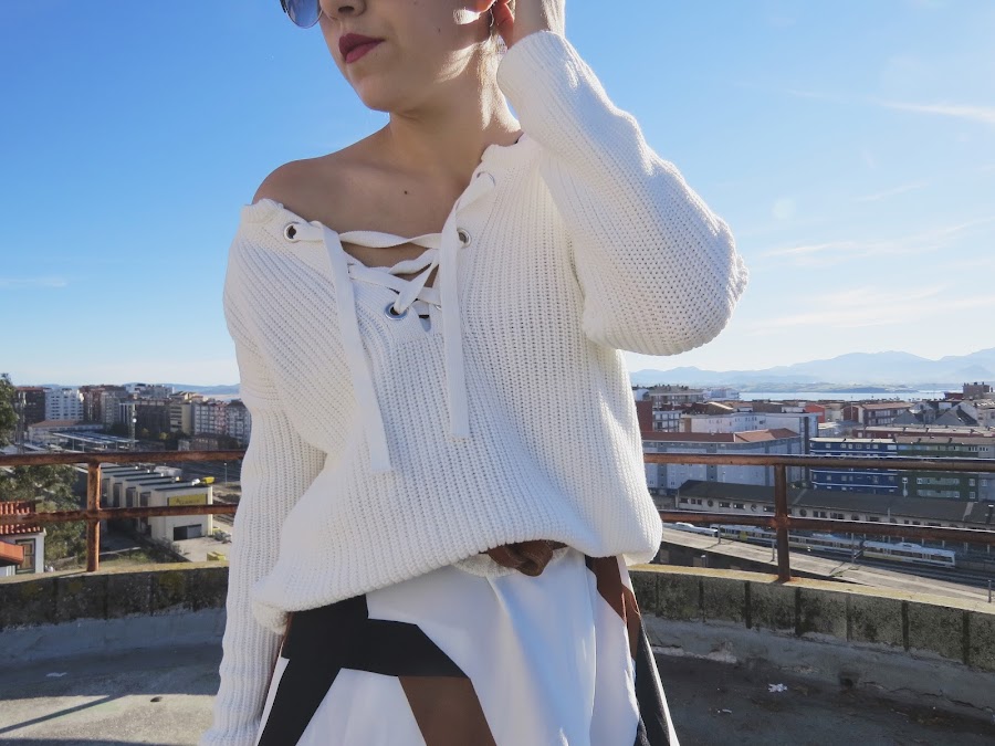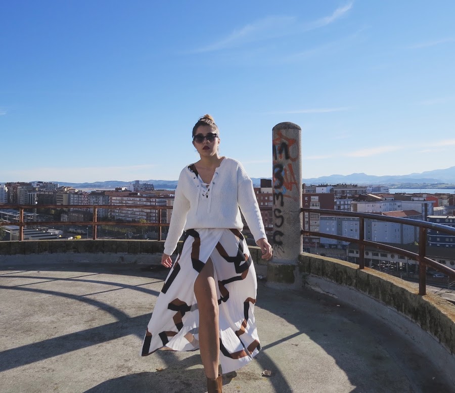 Pero bueno vamos al look de hoy, este precioso vestido con estampado asimétrico y apertura en la parte delantera, tuve que recurrir a un jersey gordito blanco lace up.
