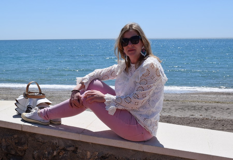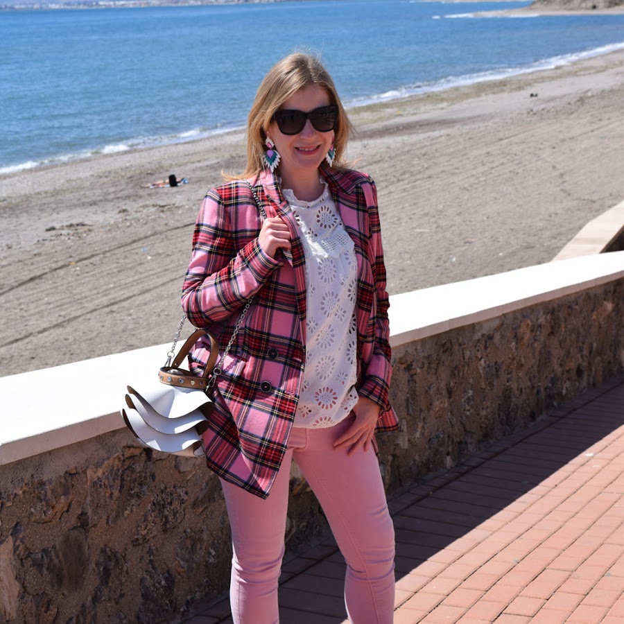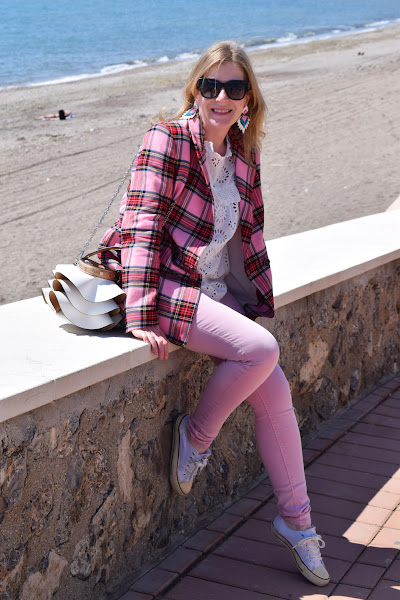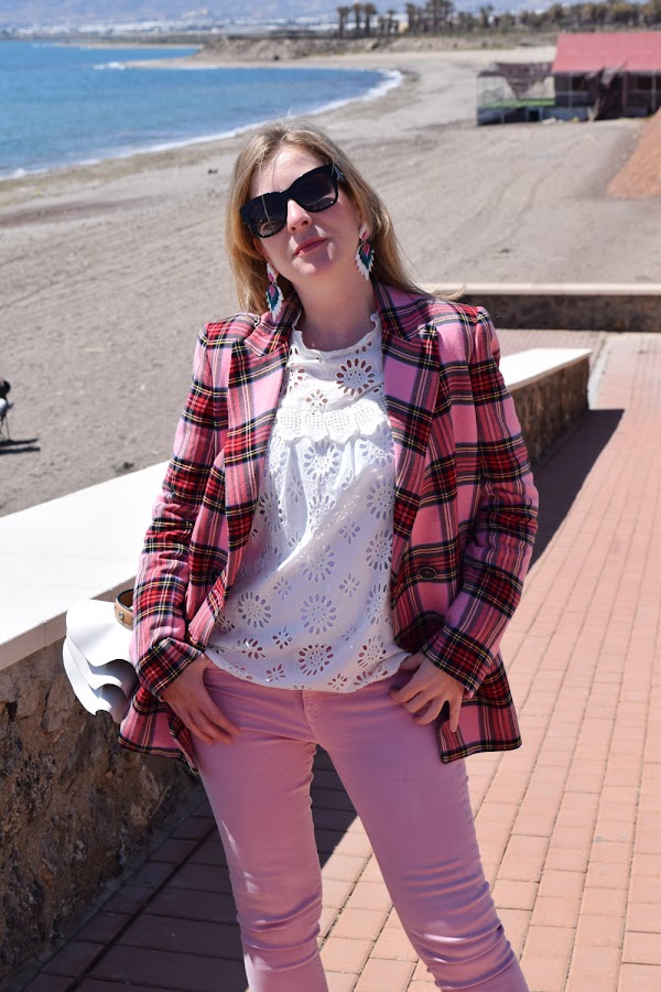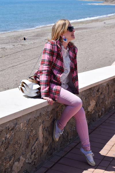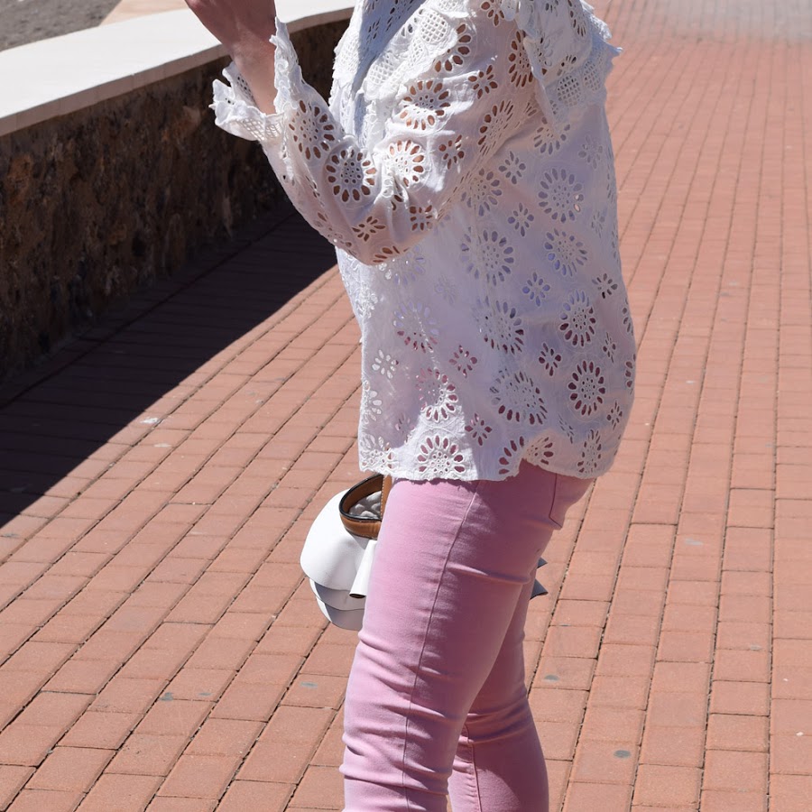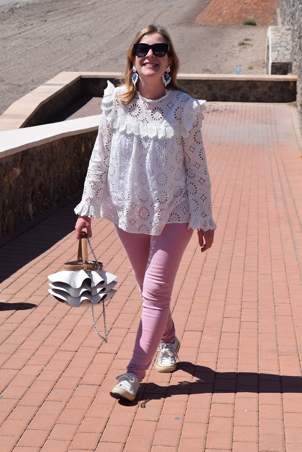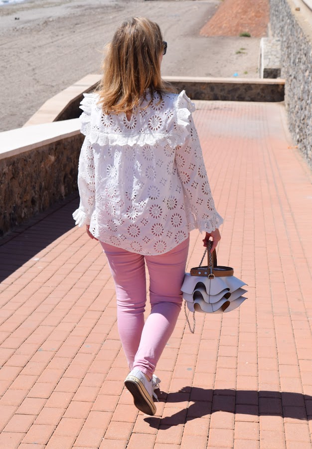 Para rematar el look, un pantalón rosa, en color más claro que los tonos de la blazer, que no empalague, y un bolso con volantes en blanco, que estaba deseando volver a llevar.