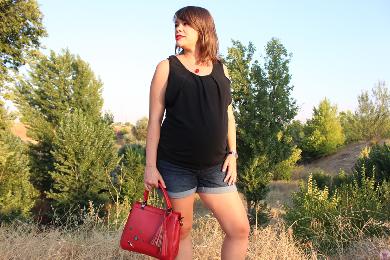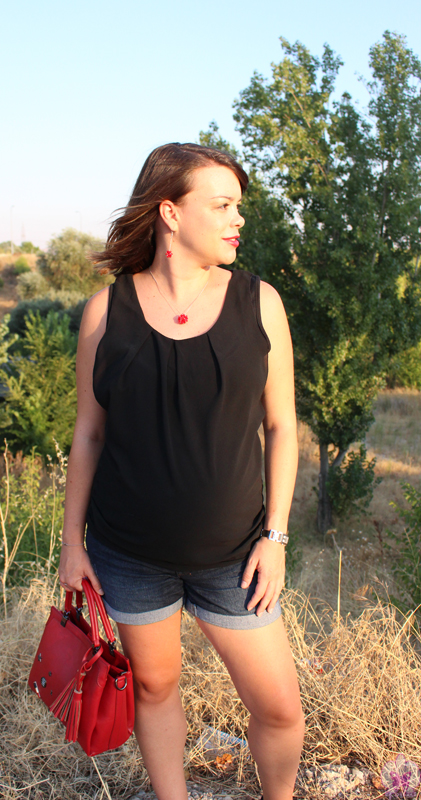 La blusa la tenéis en blanco también, yo cogí la talla XL, que quería que me entrase la panzota y su precio es de $16,49. El bolso está, además de en rojo como el mío, en beige y en negro y su precio es de $27,99.
