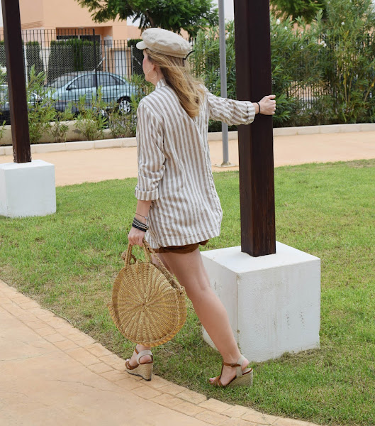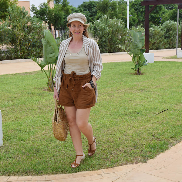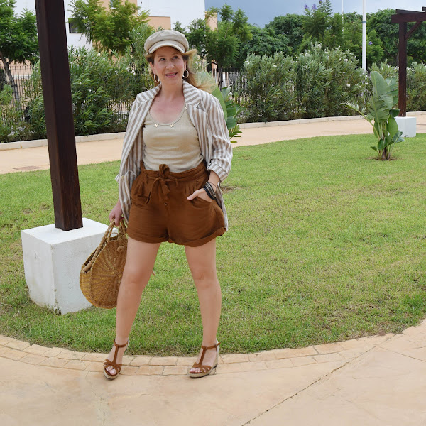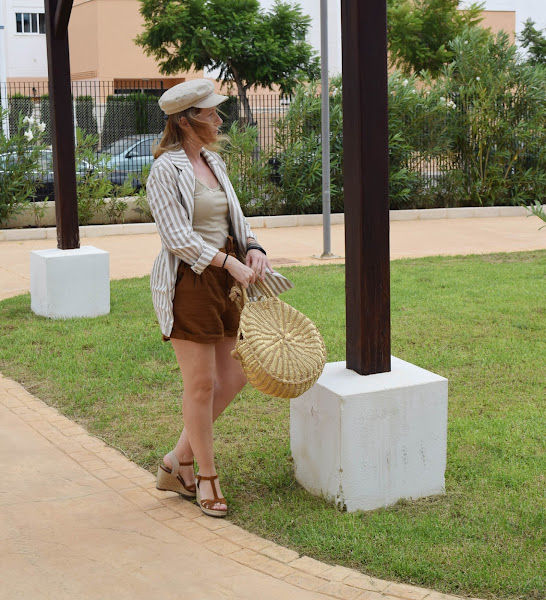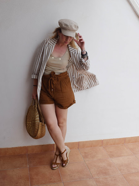 La blazer ligera me va muy bien los días en que aún el aire acondicionado está a tope, porque ya he sufrido un primer resfriado "veraniego". Y los colores entre beige y marrón claro, van perfectos para el look.