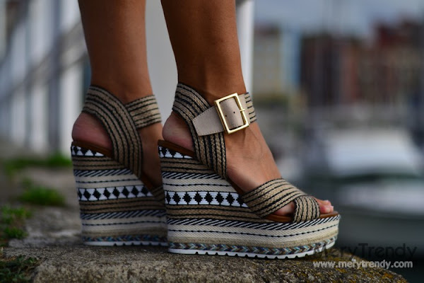 Una preciosidad de sandalia confeccionada con rafia y diseñada con motivos africanos en tonos beige, negro y blanco que desde que la viera en la shop online supe que tenía que ser mía porque me pareció sencillamente impresionante. Y, por si os lo estáis preguntando, pese a que la altura del tacón sea de 15 cm, como es ancho y tiene una plataforma de 4 cm, es bastante cómoda. Además, gracias a las dos tiras anchas del mismo material que se cruzan en la parte delantera y al cierre de pulsera en el tobillo, sujeta bastante y no siento que se me vaya el pie para delante (algo que a menudo me suele pasar ya que lo tengo muy estrechito).