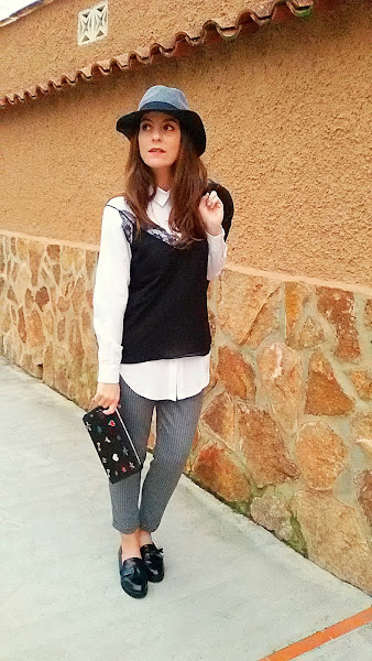 Como complementos , un sombrero gris y negro , y un clutch con varios pines de colores de Stradivarius que combinado con la biker y los zapatos masculinos creo que quedaba genial y era muy yo :)