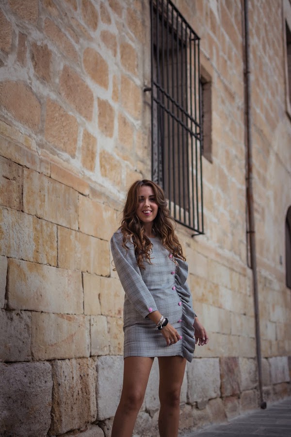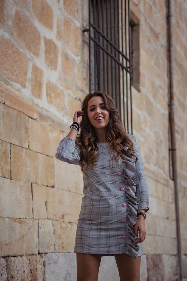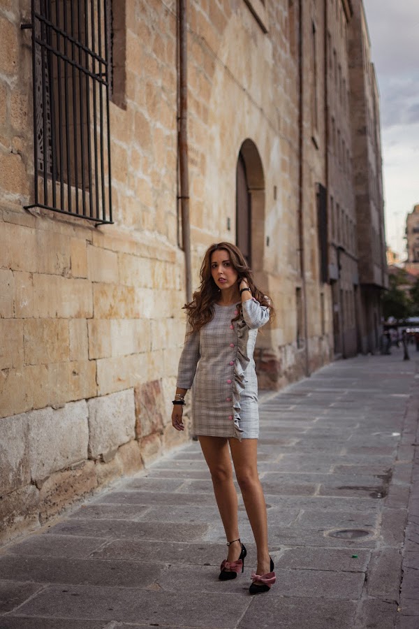 El vestido que hoy llevo, cumple todos esos requisitos, además de ser un vestido ideal para cualquier evento, desprende elegancia y sencillez a la vez, y con unos tacones como los que llevo, conseguiréis un conjunto perfecto. Le chat errant de Litt ha sido la encargada de confeccionar este vestido en su atelier de Asturias. La firma asturiana con Lisette Barrante al frente como creadora de todos los diseños, se encarga de dibujar su línea tanto a medida como prêt á couture, diseñándolas sobre patrón para luego confeccionarlas de forma individual. Es por eso que cada prenda es especial y diferente. El diseño que yo llevo, es un precioso vestido en estampado príncipe de gales en tonos grises y rosas, haciendo juego con el detalle de los botones, también en un rosa pálido. Lleva un detalle de volante que va desde el hombro hasta el final del vestido y su manga, es ligeramente abullonada lo que le da un toque muy elegante.