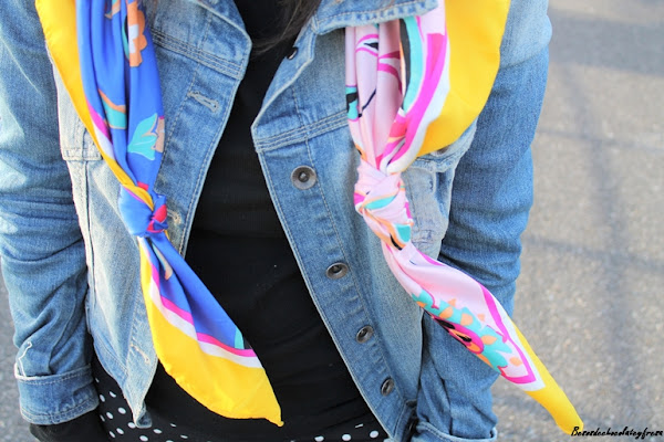 Blanco y negro con un adosis pequeña de estampado podría definirse el outfit de hoy combinando los pantalones con sweater finito negro de cuello cisne, tejana, sneakers y pañuelo multicolor en pico y anudado en los extremos (otra manera de llevar nuestros pañuelos y pañoletas.