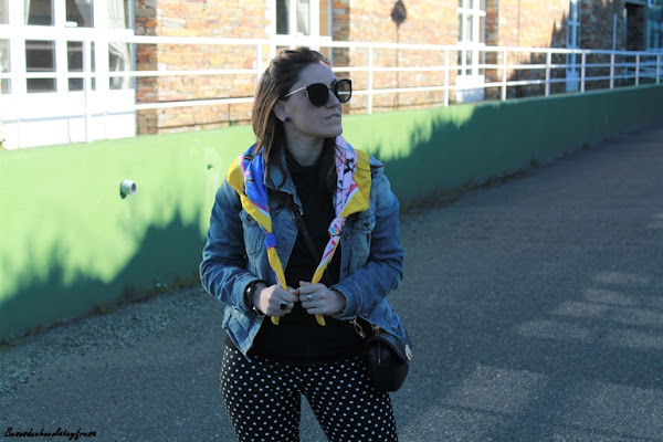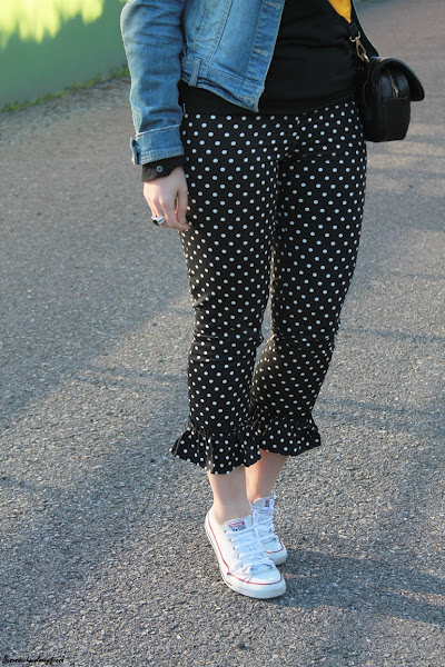 En el look de hoy os traigo esta tendencia en los pantalones que a simple vista son los típicos clásicos negros con lunares pero tienen un punto diferente en el bajo con el detalle de volantes a lo folclórica y que le da mucho rollazo y personalidad.