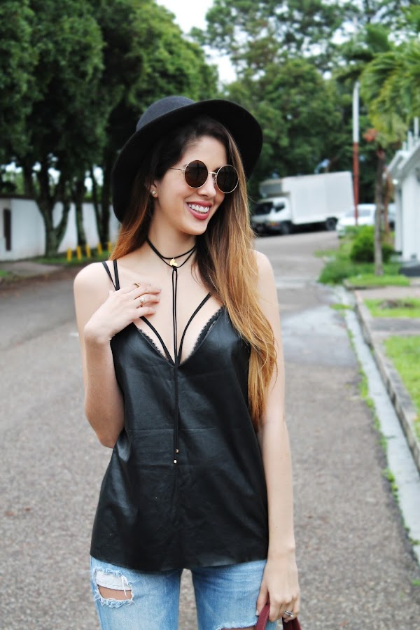 Esta camisa de cuero sintético con el bralette son ambos los encargados de aportar ese toque a todo el look. Decidí dejar el resto muy básico y simple con unos jeans rotos, sombrero, mis nuevas sandalias negras, una cartera color vino (el pop de color) y mi nuevo accesorio favorito este precioso choker que ¡Queda bien con TODO!