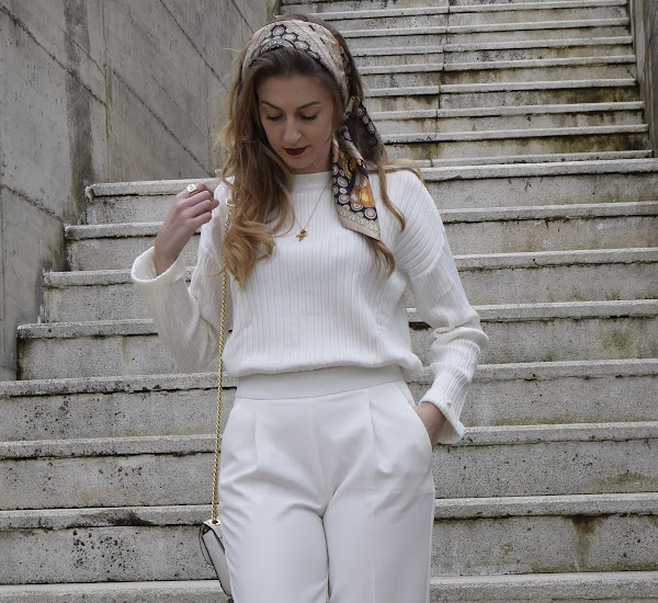 En este primer look le añadí un jersey blanco y como complemento, he elegido un pañuelo de diadema, que por cierto están muy de moda esta temporada y para mi tienen ese Je ne sais quoi que me recuerda a las divas de los años 50 . En cuanto a los demás complementos las sandalias doradas y bolso blanco de Michael Kors, que ya os he enseñado en anteriores post, le dan el toque de fiesta.