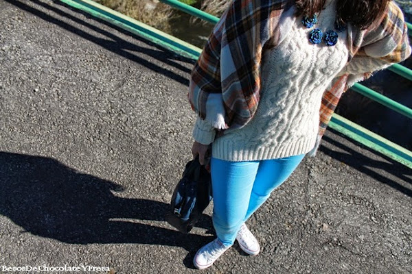 Vamos con el look, que me lío jeje. Llevo jeans azul pitufo con sweater de ochos en blanco roto, converse y como complementos collar de flores en azul, pendientes de gota de agua, bolso azul y bufamanta en los mismo tonos.