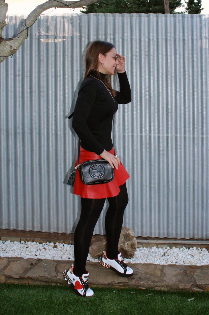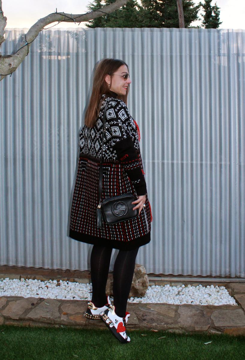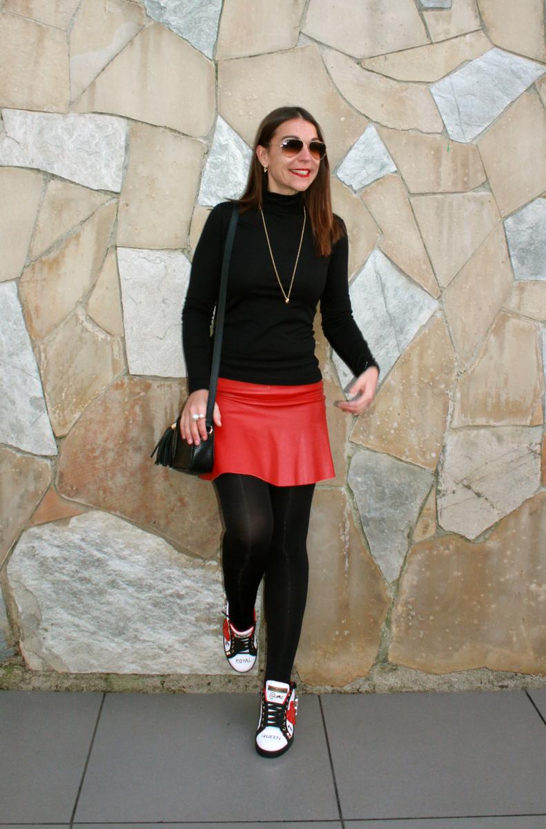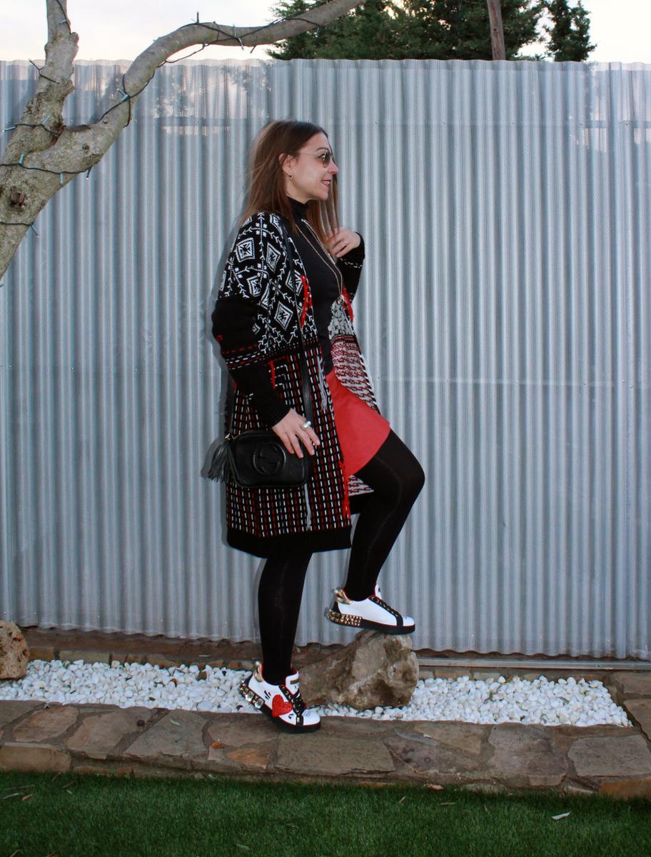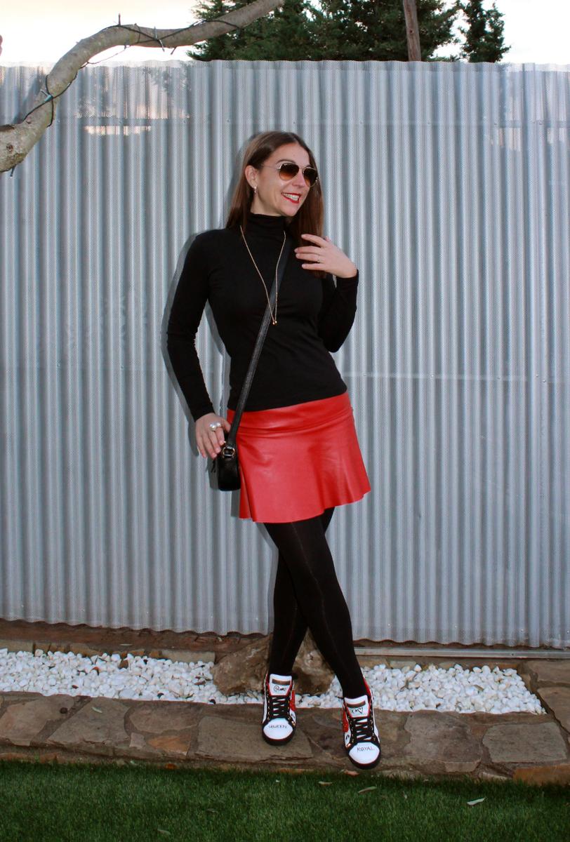 Así que partiendo de las zapatillas y de los tonos blanco, rojo, negro, he creado un look muy sencillo pero muy vistoso. Falda de polipiel roja, jersey básico negro y chaqueta de lana con motivos étnicos. Un outfit super cómodos y válido para un montón de situaciones diarias.