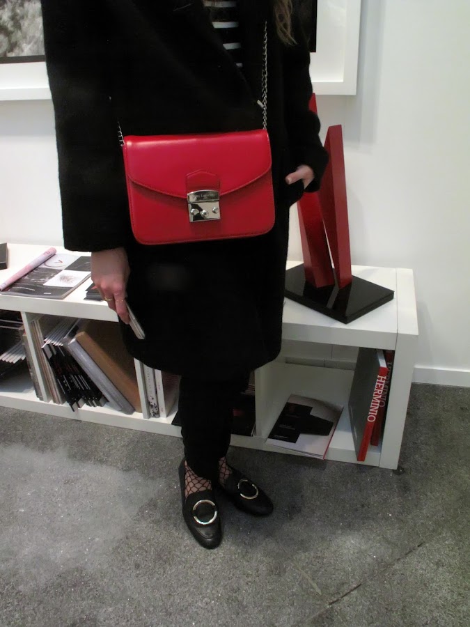 La nota de color la da el bolso de Guy Laroche y la originalidad los zapatos estilo vintage con media de rejilla tan de moda esta temporada.