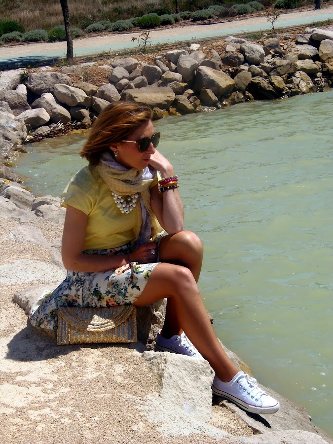 Tenía claro que me apetecía poner esta falda, pero siempre que me la había puesto había sido con tacón y creando un look más formal y arreglado. Como quería ir cómoda, pensé en ponerme mi calzado comodín de esta temporada (converse), y una camiseta básica en uno de los colores estrella de esta temporada y que tanto saco en el blog ;)), y el resultado me gusto mucho.