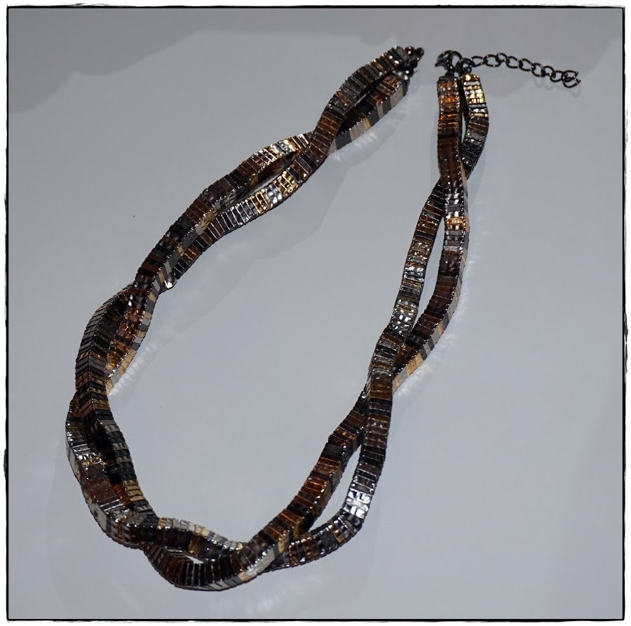 Ahora paso ya a hablaros de los complementos, que son dos collares y un brazalete. El primer collar es de doble vuelta entrelazada, que combina varios tonos de metal, una pieza muy original, y a la vez básica para casi cualquier look: