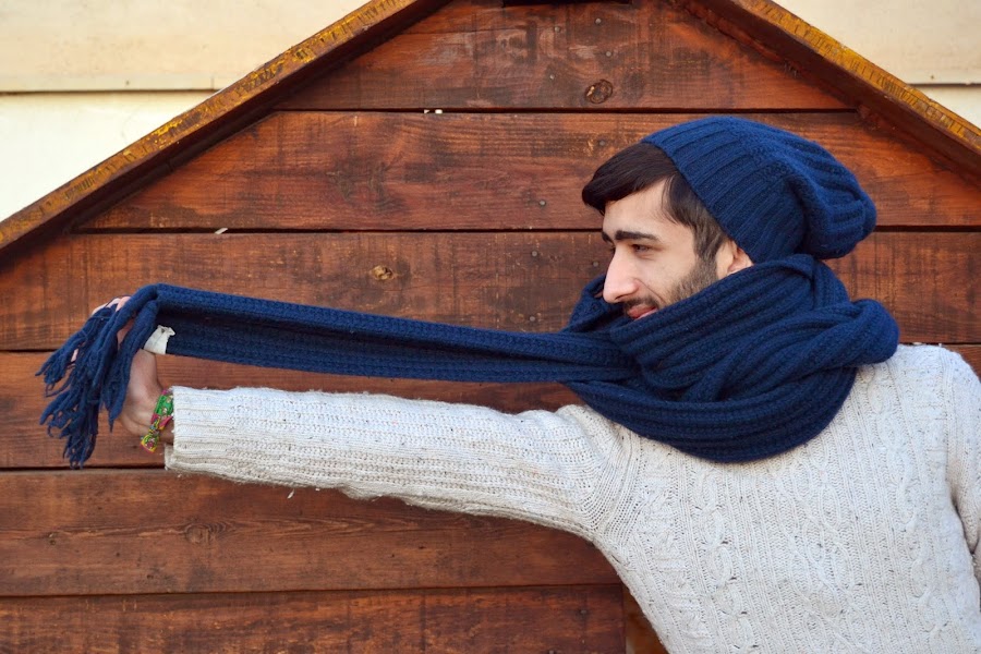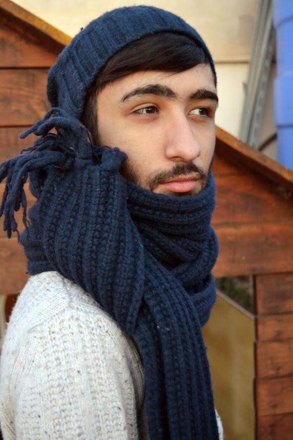 Para un día de frío y redondo donde a las 22:30 de la noche caes redondo a la cama y te duermes pleno y feliz me puse un jersey de lana color hueso, y un juego de bufanda y gorro en azul marino. Para estar de lo más caliente.
