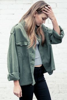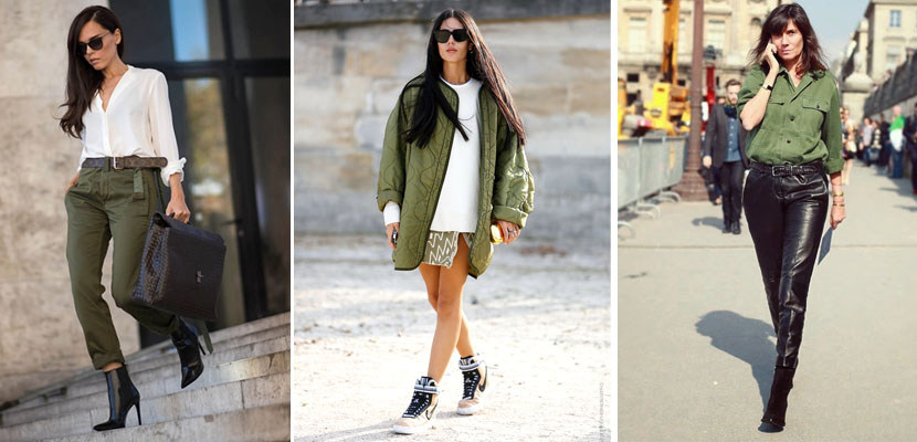 -Nos encantan looks como: las camisas abiertas en color caqui con mini faldas negras, las sobrecamisas o trench de estilo militar con look masculino, o simplemente, llevar una cazadora verde militar firmando un look más ingenio o formalito.
