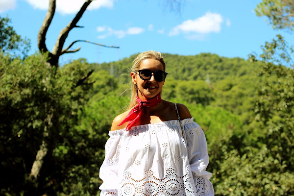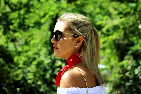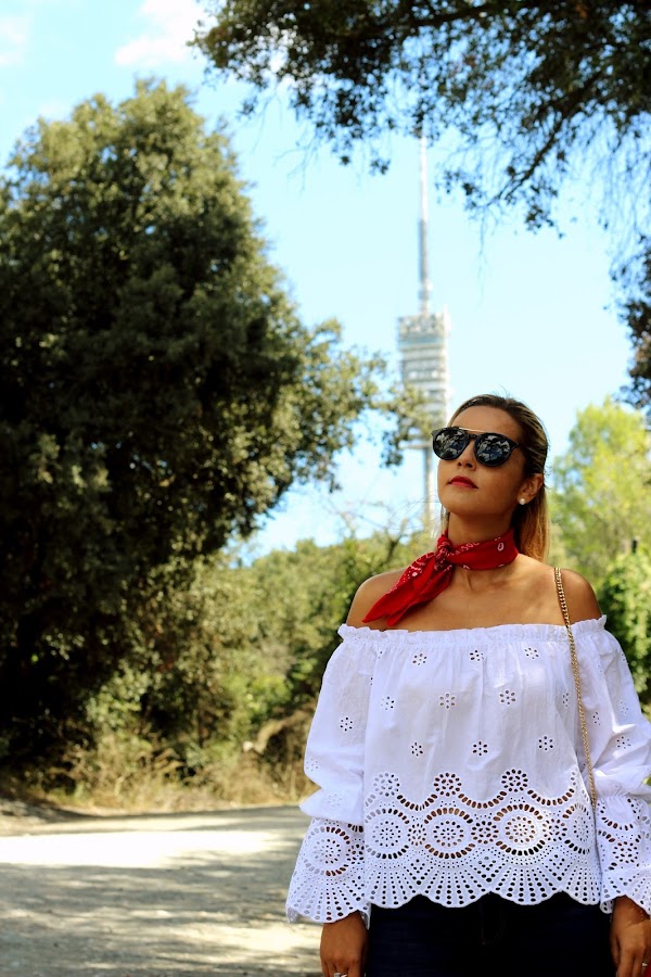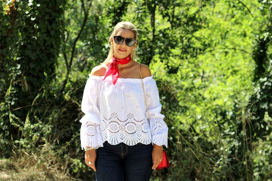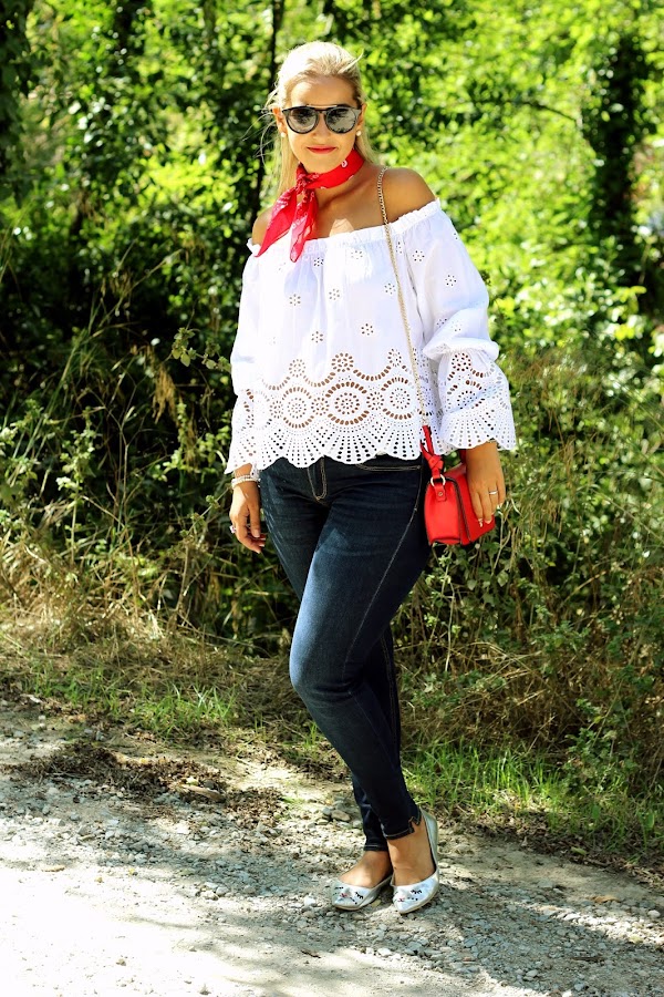 Hoy os traigo un look casual, muy sencillo pero con un toque chic. En el look de hoy os enseño mi blusa blanca con bordados y hombros descubiertos que compré en rebajas y me pareció super dulce. La combiné con unos jeans y para darle un toque de color, me puse una bandana roja. Los accesorios del look fueron mis manoletinas plateadas y mi bolso rojo.