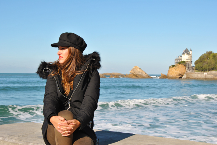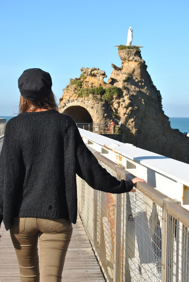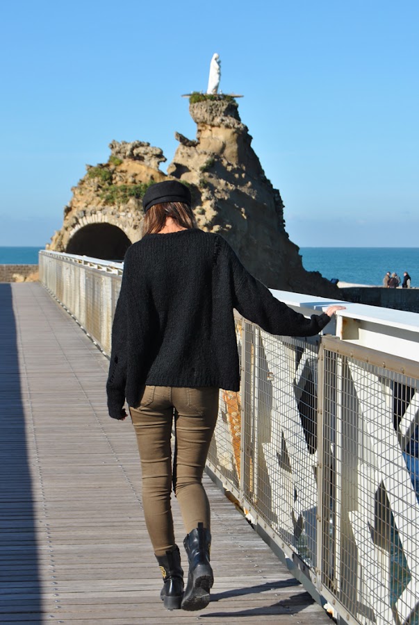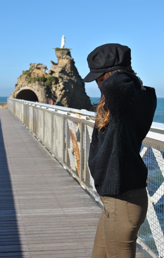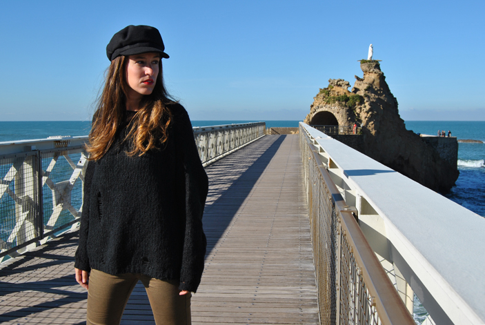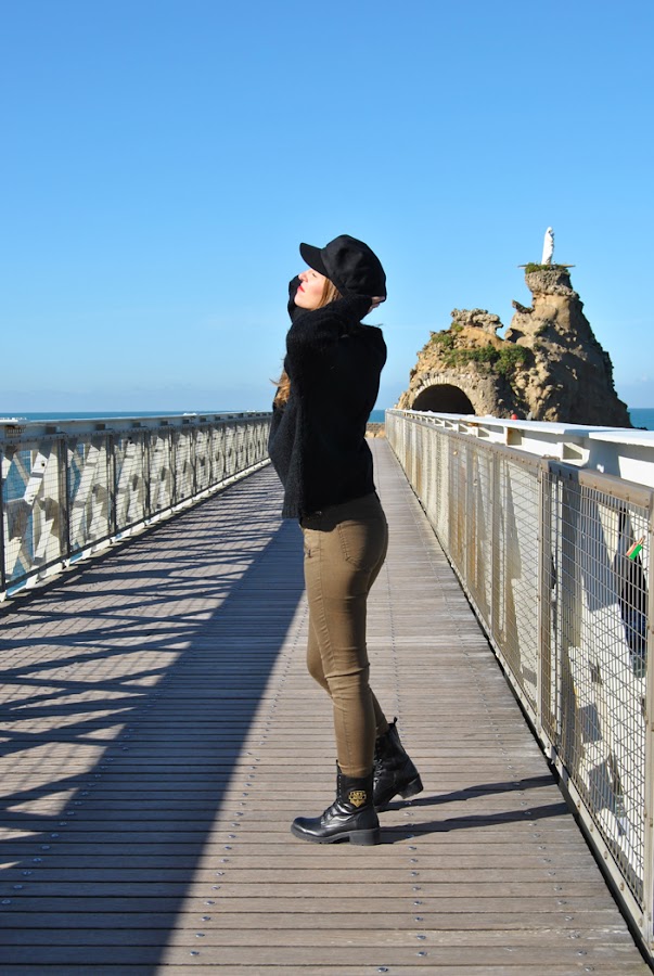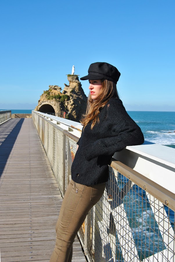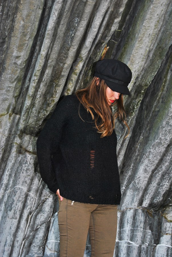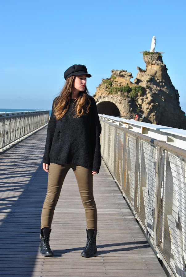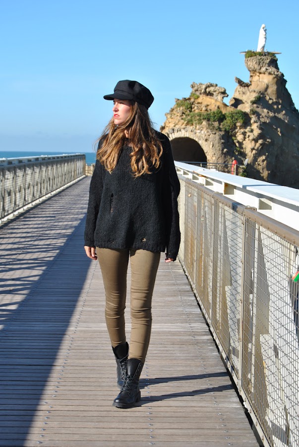 El look que llevé esta maratoniana jornada de viaje estuvo compuesto por jeans pitillo kaki con jersey de punto negro con rotos, que complementé con mis nuevas botas de estilo militar y mi baker boy, dos imprescindibles en mi armario este invierno.