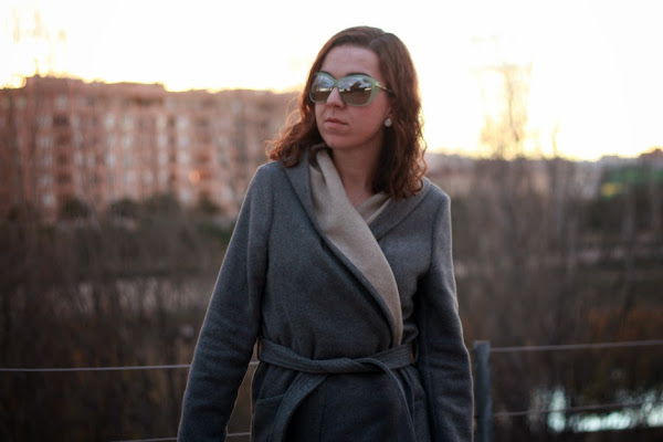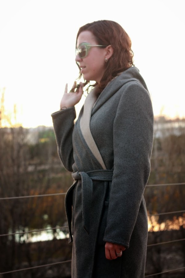Completé el look con mi abrigo batín que me gusta mucho y además sus maxibolsillos son muy cómodos, con unos botines de cuña y aporté un toque de color con las gafas en verde menta ¿preciosas verdad?