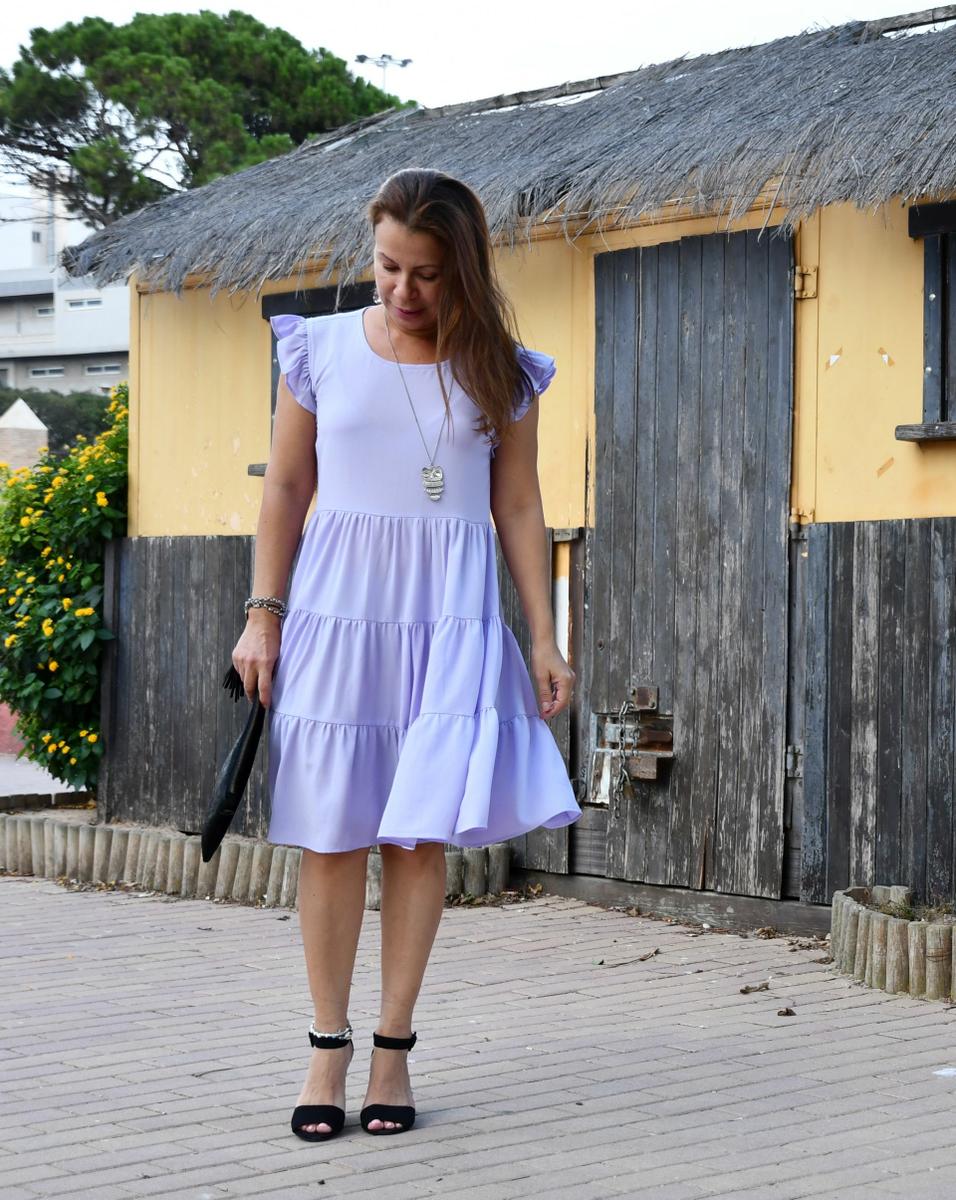 Vestido Lila Aquí lo combiné con el famoso capazo y las cuñas de rafia que para mí son imprescindibles en el verano, para dar más color y un toque especial, le coloqué al capazó el pañuelo colorido, que si prefieres podrías llevarlo quizá en la cabeza haciendo una coleta, que es una de las tendecncias de este verano. Las pulseras y el collar, en materiales naturales, para seguir con ese aire libre del verano.