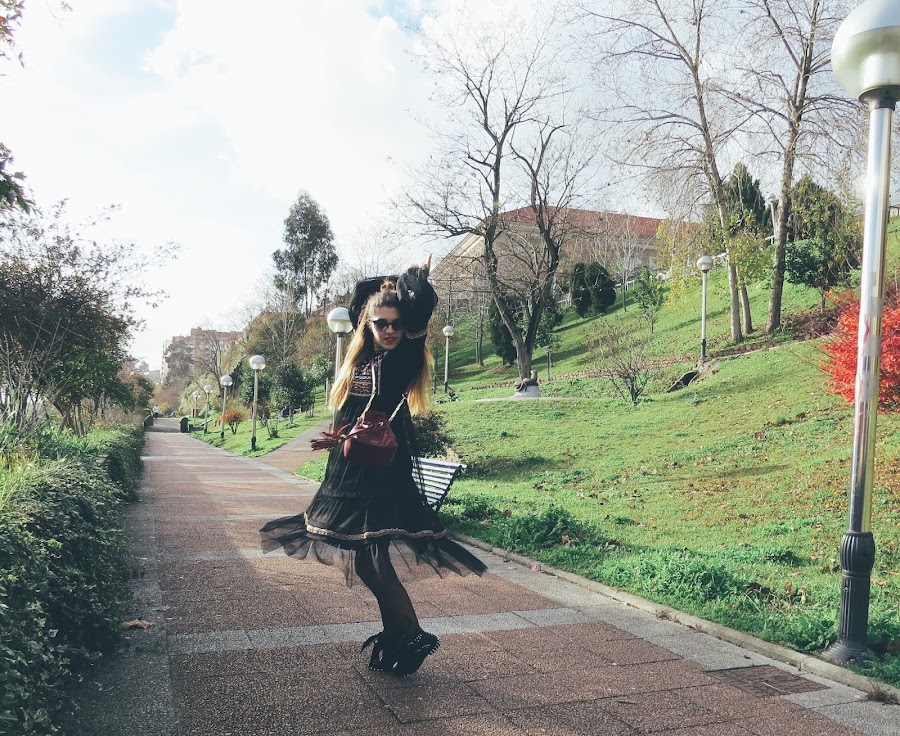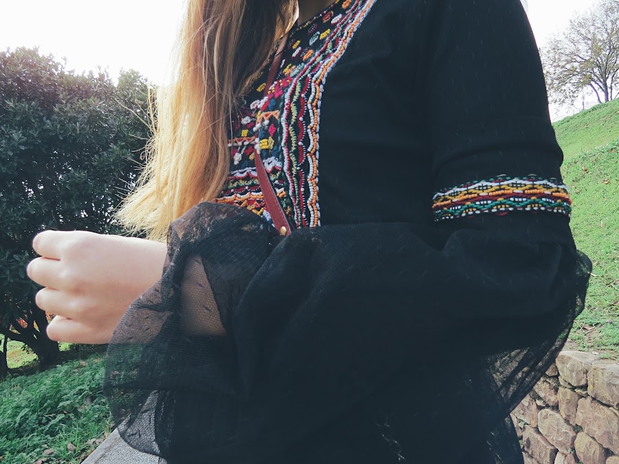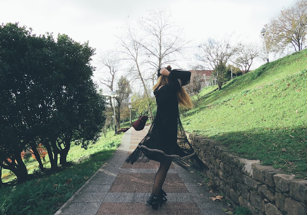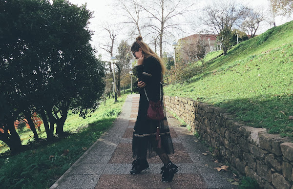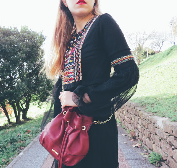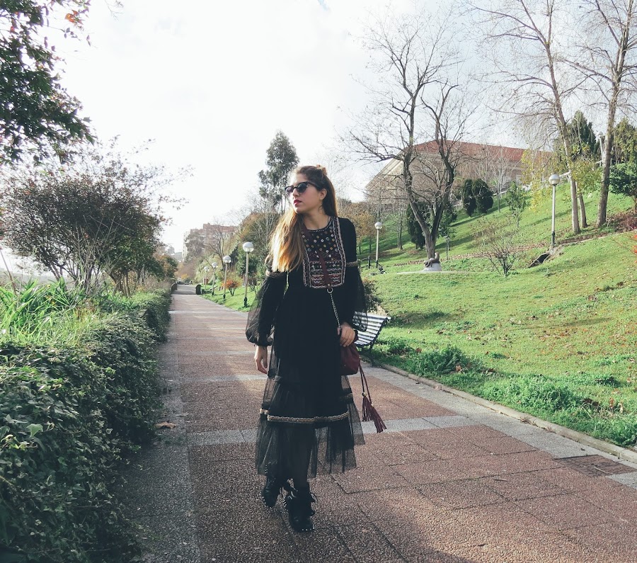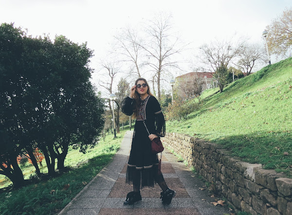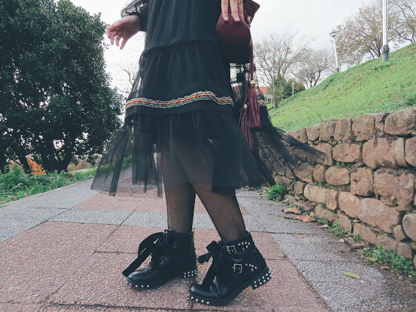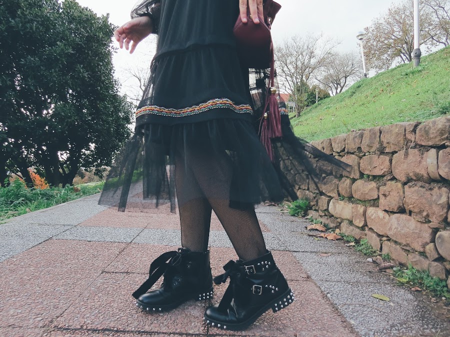 Ademas tiene mangas abullonadas que sientan genial, es un vestido de estilo boho, pero lo combine con un botas estilo militar con tachuelas y lazos de terciopelo y unas medias de red.