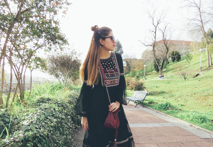 Also has puffed sleeves that feel great, it is a boho style dress, but combine it with a half-style boots with tacks and a stockings net.
