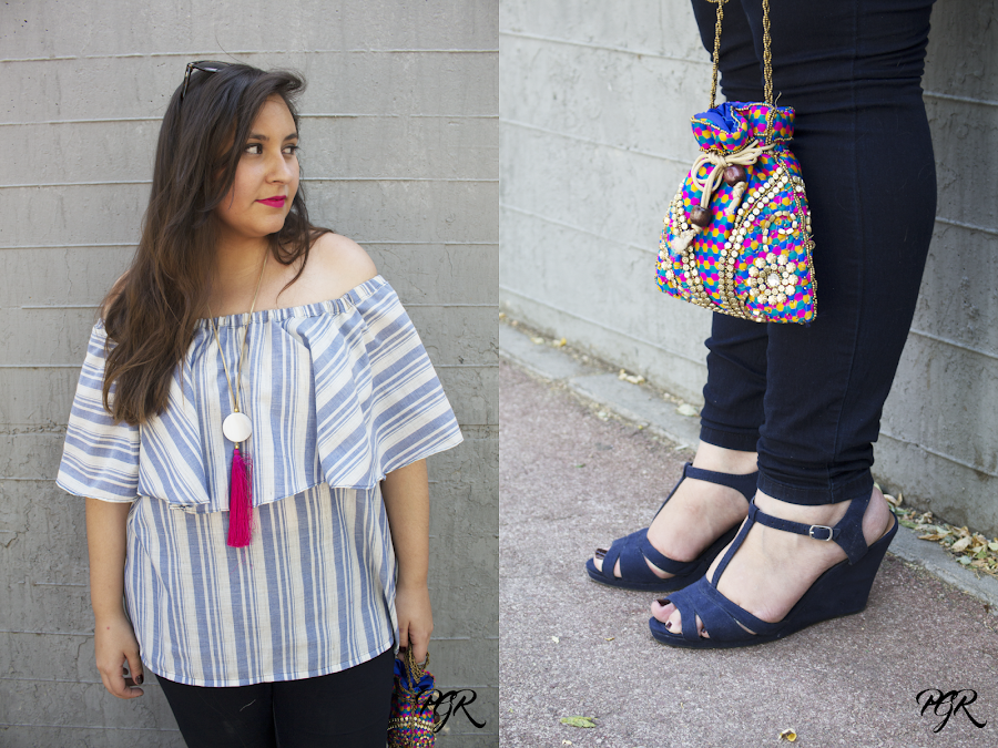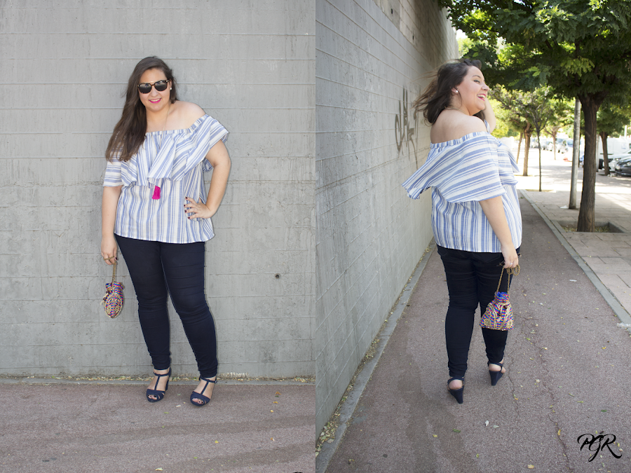 La tela es tipo lino, siendo perfecta para el verano por su ligereza, el estampado de rayas todo un clásico que no pasa de moda y elegí el cuello bardot con volante porque llevo mucho queriendo una blusa de este tipo pero nunca encuentro de mi talla o que me quede en su sitio.