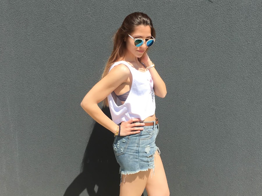 Yo he elegido un crop top blanco, de corte ancho y con un oasis en tonos lilas y rosas, la he combinado con mis shorts rasgados y unas zapatillas.