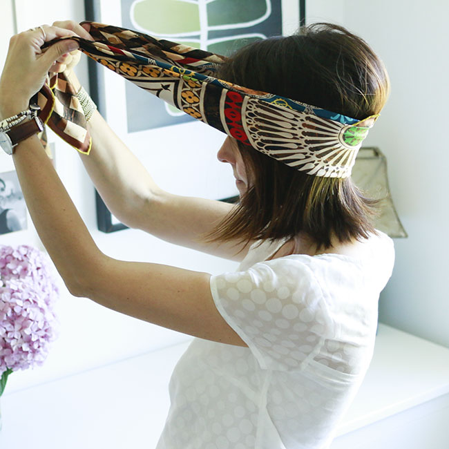 2. Pásalo desde la nuca hasta la frente, por encima del pelo, y haz una lazada, irregular, abultada, loca.
