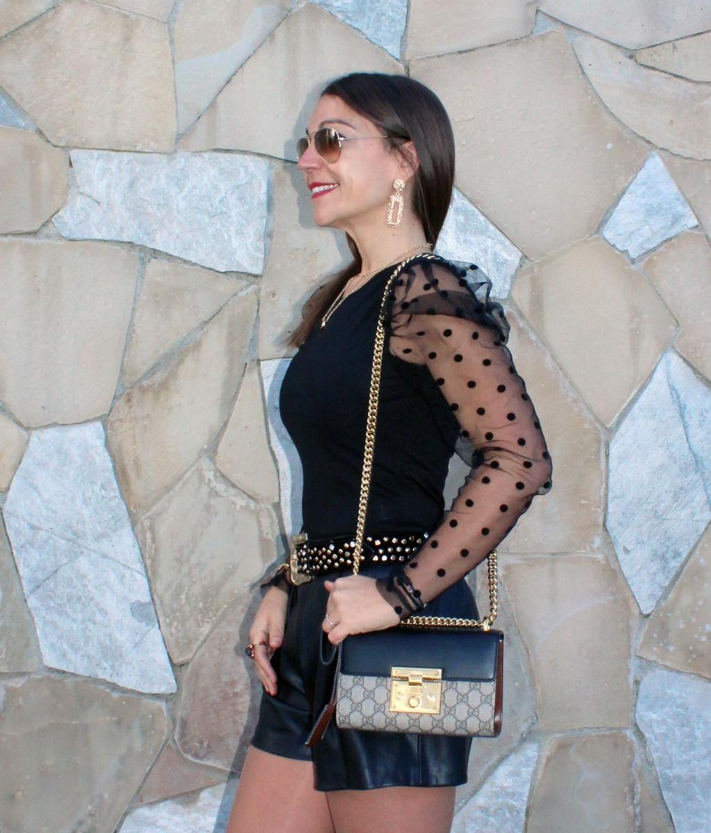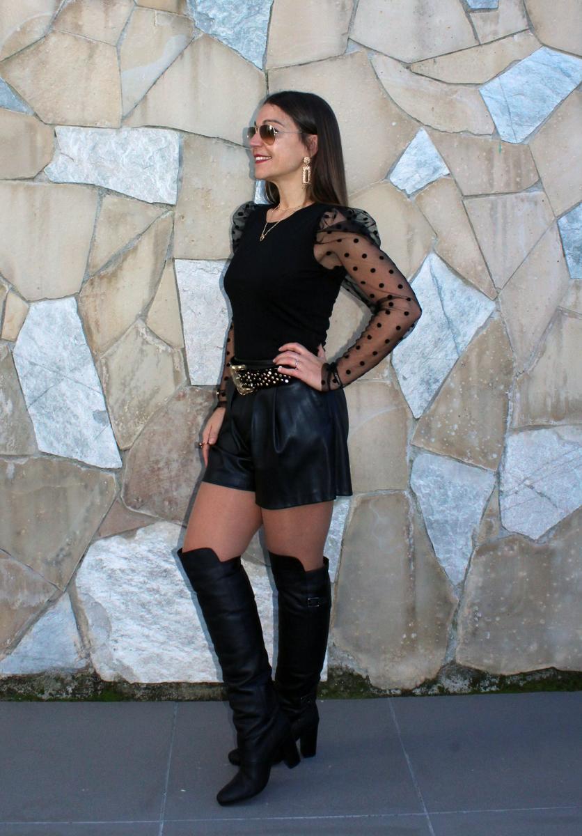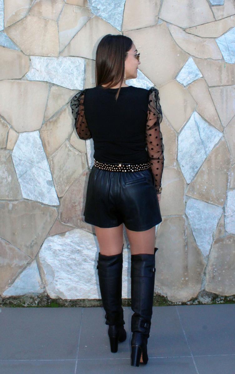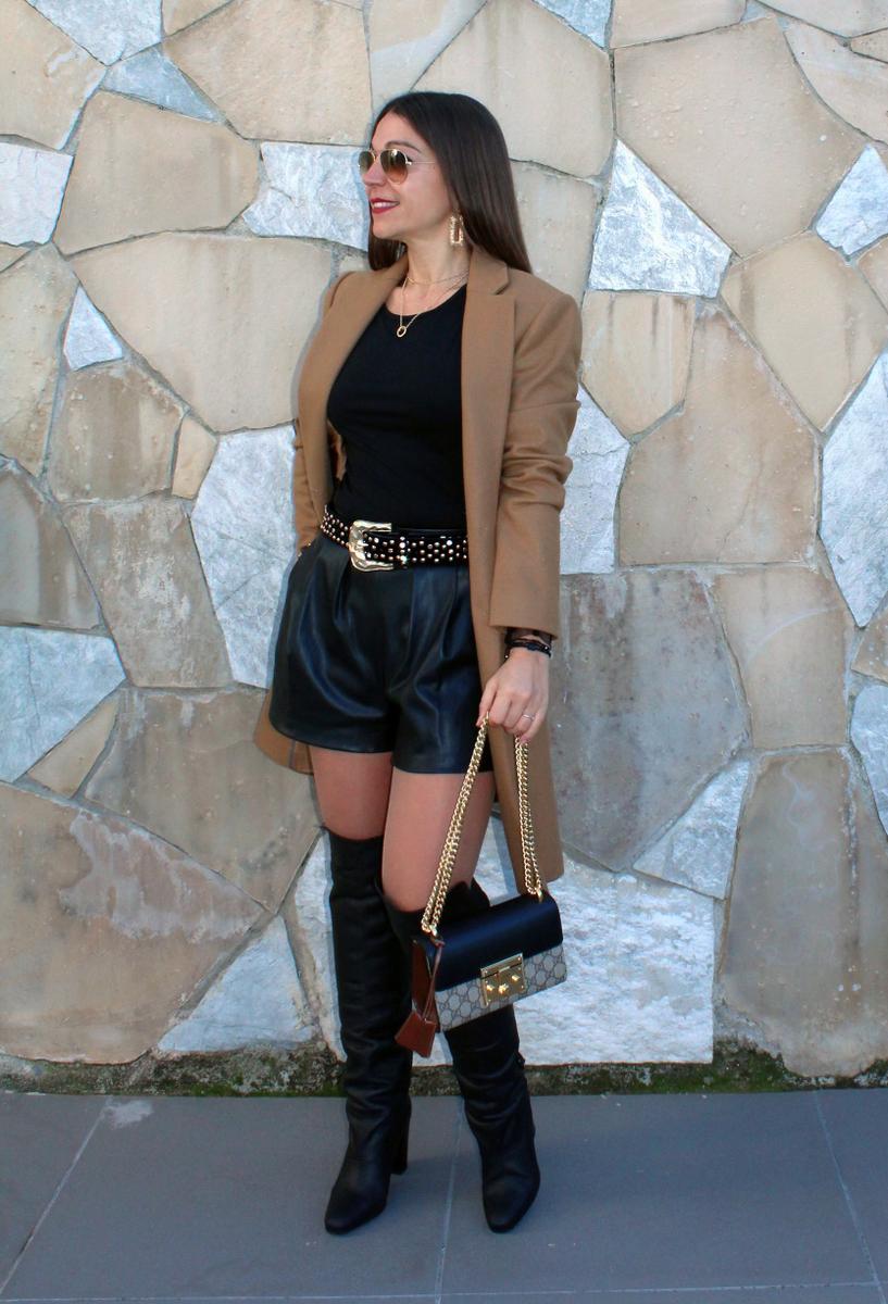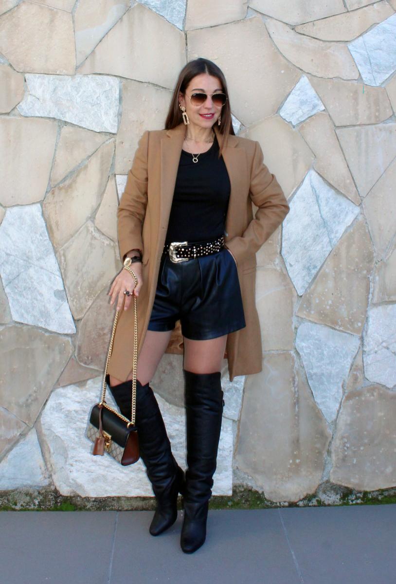 El look de hoy es un black and brown, se podría decir que es un total black, si no fuera por el abrigo en camel . La combinación bastante sencilla, shorts de cuero con botas mosqueteras, top y cinturón con tachuelas, hasta aquí el negro y la segunda parte de la bicromía lo aporta el abrigo y los tonos marrones del bolso.