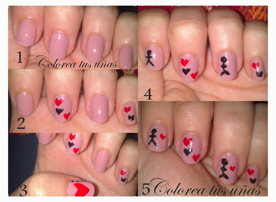 Realizar los dibujillos. Yo los fui haciendo por partes, como podéis ver: primero los corazones de los dedos meñique y corazón, despues el corazón y los puntos en el dedo gordete, los muñequitos y por último los corazones que acompañan a los muñecos.