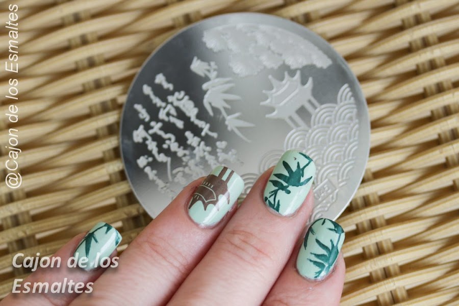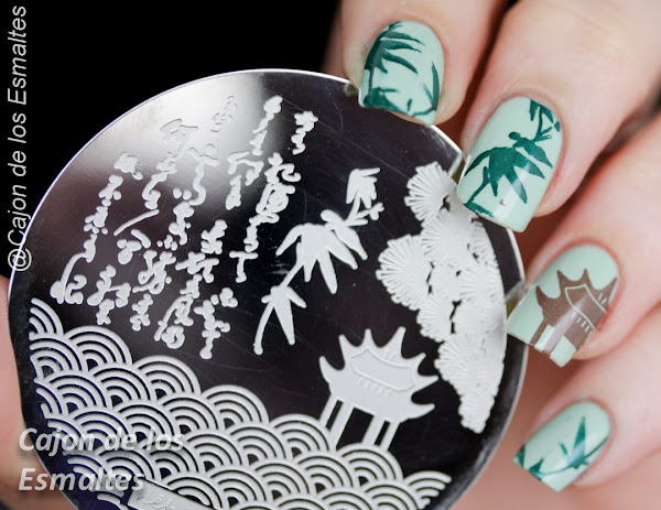 Hice dos opciones diferentes, la primera mezclando el pabellón con el el bambú. El color de base es Green Tea de Sally Hansen. Pero les recomiendo ver este video de una colega y compatriota Alexandra Polvarini que la rompió con su reseña de esta misma placa: https://www.youtube.com/watch?v=FYAOUcz8IAQ. Si les interesa el estampado para decorar uñas los videos de Alexandra les van a resultar muy útiles.