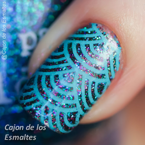 Segunda opción con la misma placa usando el diseño de olas. También podrían ser escamas de dragón...o sirena, pero pongamos que dragón tiene más sentido en el contexto de una placa de diseños asiáticos o chinos. El color que usé para estampar es un este turquesa de Mundo de Uñas (#24 Aqua). El esmalte de base es una belleza "indie", Elderberry de la marca Nail Pattern Boldness.