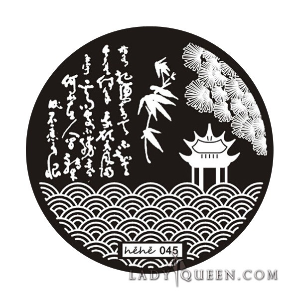 Tengo muchas placas de estampar "made in china" en mi colección pero no tenía ninguna placa de ese origen con diseños orientales...hasta que llegaron a mi poder las placas de la marca HeHe(*). Hoy les muestro la placa He He 045 dedicada a temas asiáticos con un pabellón y letras chinas, hojas de bambú y un patrón de olas o escamas al estilo dragón.