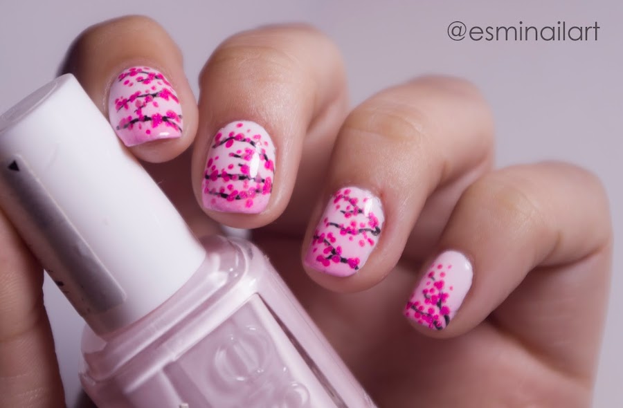 Las ramas de los cerezos las realicé con un pincel fino y pintura acrílica negra, y las florecillas con una dotting tool y esmalte.